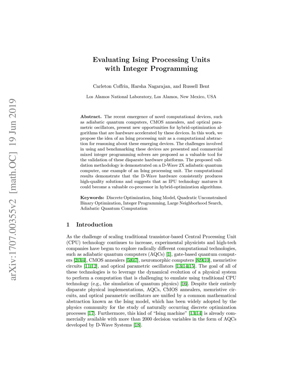 The recent emergence of novel computational devices, such as adiabatic quantum computers, CMOS annealers, and optical parametric oscillators, present new opportunities for hybrid-optimization algorithms that are hardware accelerated by these devices. In this work, we propose the idea of an Ising processing unit as a computational abstraction for reasoning about these emerging devices. The challenges involved in using and benchmarking these devices are presented and commercial mixed integer programming solvers are proposed as a valuable tool for the validation of these disparate hardware platforms. The proposed validation methodology is demonstrated on a D-Wave 2X adiabatic quantum computer, one example of an Ising processing unit. The computational results demonstrate that the D-Wave hardware consistently produces high-quality solutions and suggests that as IPU technology matures it could become a valuable co-processor in hybrid-optimization algorithms.