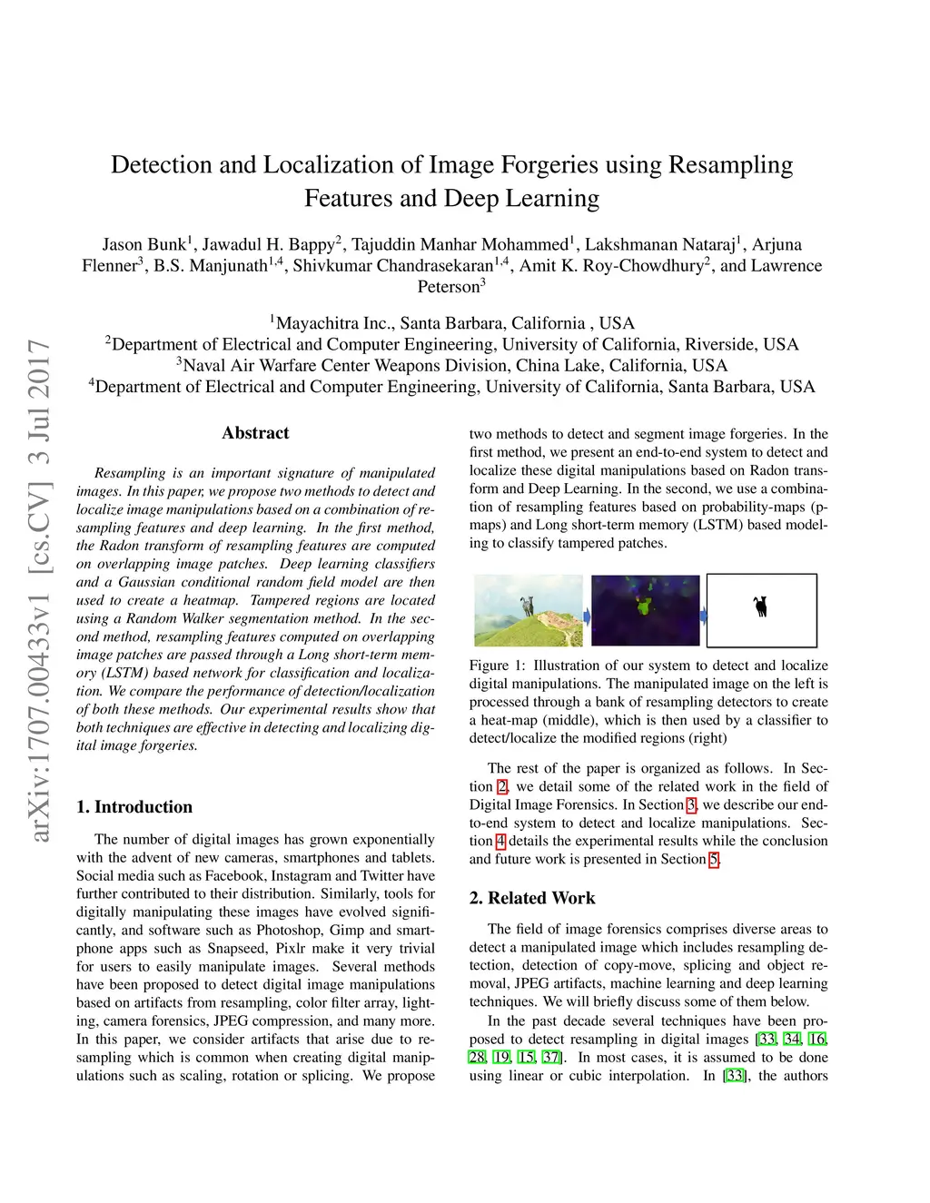 Resampling is an important signature of manipulated images. In this paper, we propose two methods to detect and localize image manipulations based on a combination of resampling features and deep learning. In the first method, the Radon transform of resampling features are computed on overlapping image patches. Deep learning classifiers and a Gaussian conditional random field model are then used to create a heatmap. Tampered regions are located using a Random Walker segmentation method. In the second method, resampling features computed on overlapping image patches are passed through a Long short-term memory (LSTM) based network for classification and localization. We compare the performance of detection/localization of both these methods. Our experimental results show that both techniques are effective in detecting and localizing digital image forgeries.