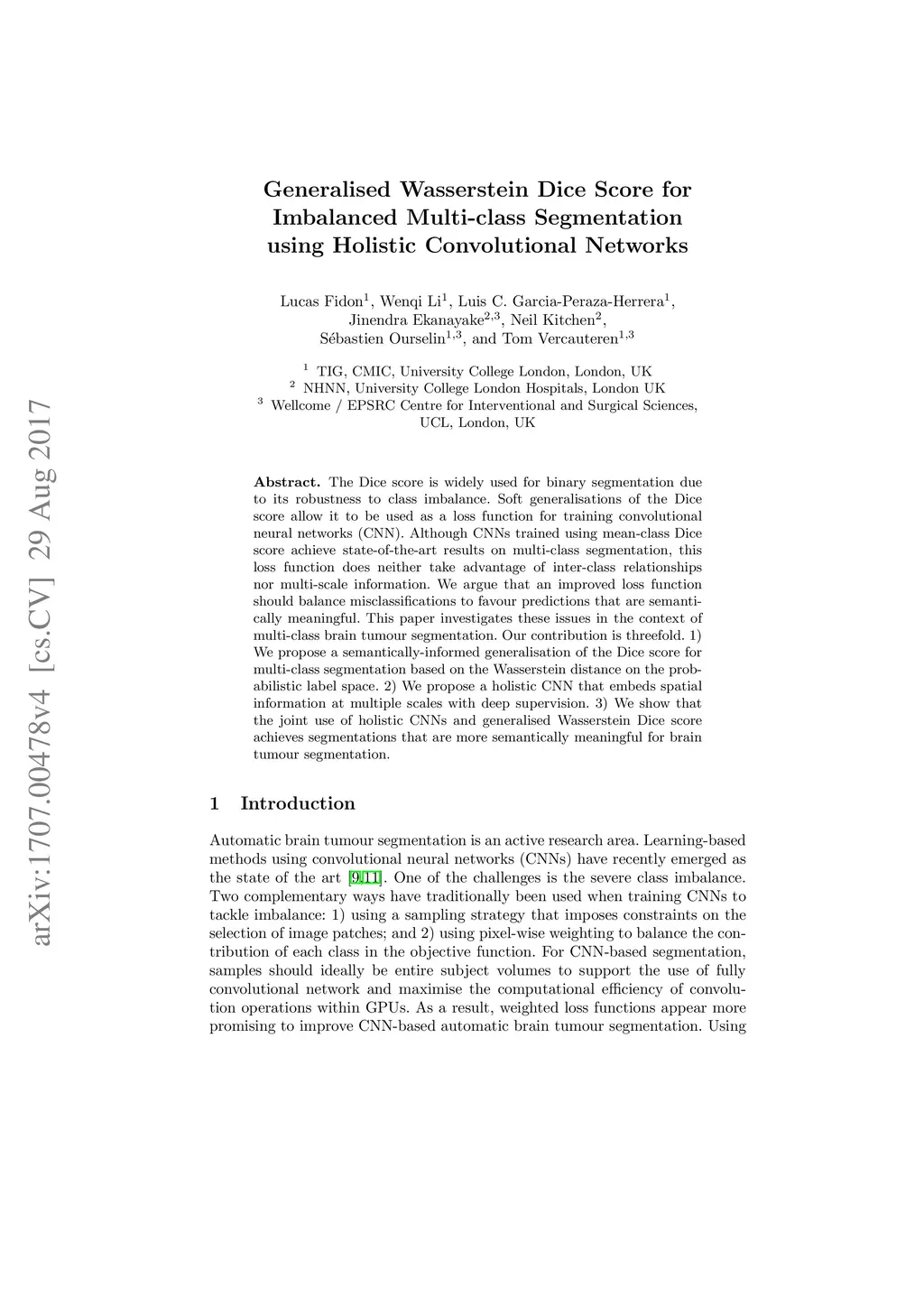 Generalised Wasserstein Dice Score for Imbalanced Multi-class Segmentation using Holistic Convolutional Networks