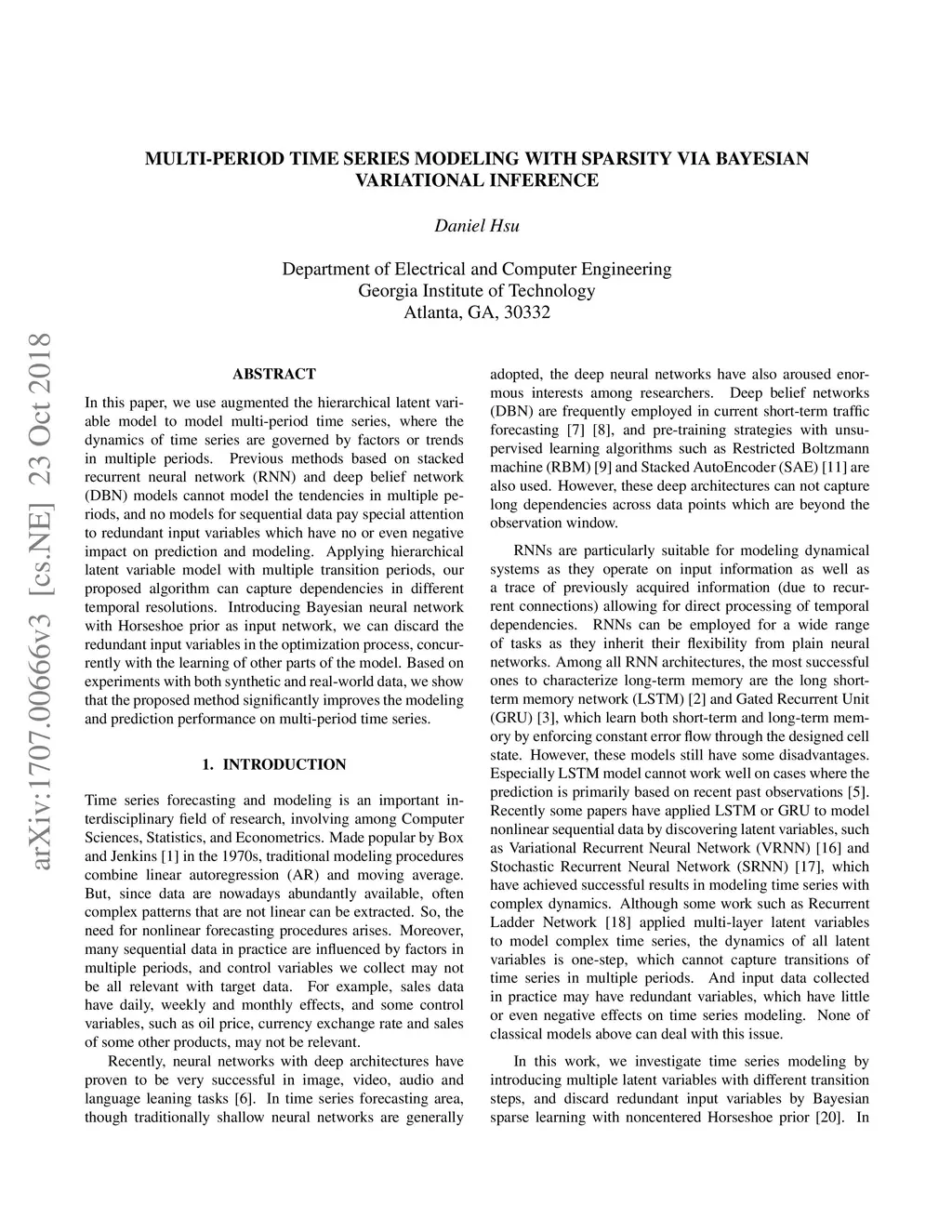 In this paper, we use augmented the hierarchical latent variable model to model multi-period time series, where the dynamics of time series are governed by factors or trends in multiple periods. Previous methods based on stacked recurrent neural network (RNN) and deep belief network (DBN) models cannot model the tendencies in multiple periods, and no models for sequential data pay special attention to redundant input variables which have no or even negative impact on prediction and modeling. Applying hierarchical latent variable model with multiple transition periods, our proposed algorithm can capture dependencies in different temporal resolutions. Introducing Bayesian neural network with Horseshoe prior as input network, we can discard the redundant input variables in the optimization process, concurrently with the learning of other parts of the model. Based on experiments with both synthetic and real-world data, we show that the proposed method significantly improves the modeling and prediction performance on multi-period time series.