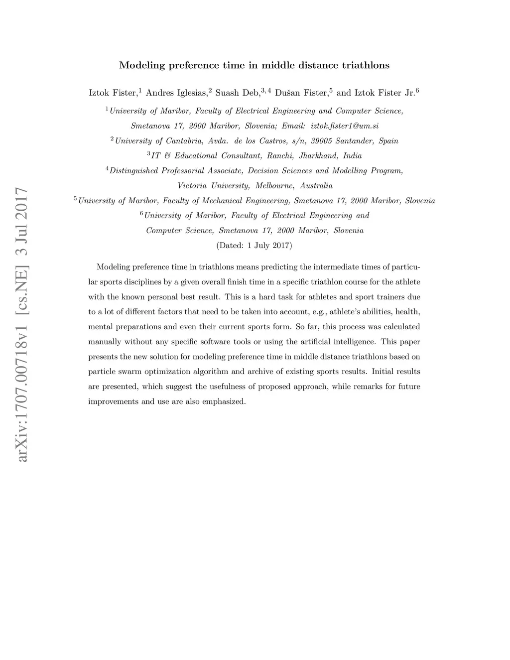 Modeling preference time in triathlons means predicting the intermediate times of particular sports disciplines by a given overall finish time in a specific triathlon course for the athlete with the known personal best result. This is a hard task for athletes and sport trainers due to a lot of different factors that need to be taken into account, e.g., athlete's abilities, health, mental preparations and even their current sports form. So far, this process was calculated manually without any specific software tools or using the artificial intelligence. This paper presents the new solution for modeling preference time in middle distance triathlons based on particle swarm optimization algorithm and archive of existing sports results. Initial results are presented, which suggest the usefulness of proposed approach, while remarks for future improvements and use are also emphasized.