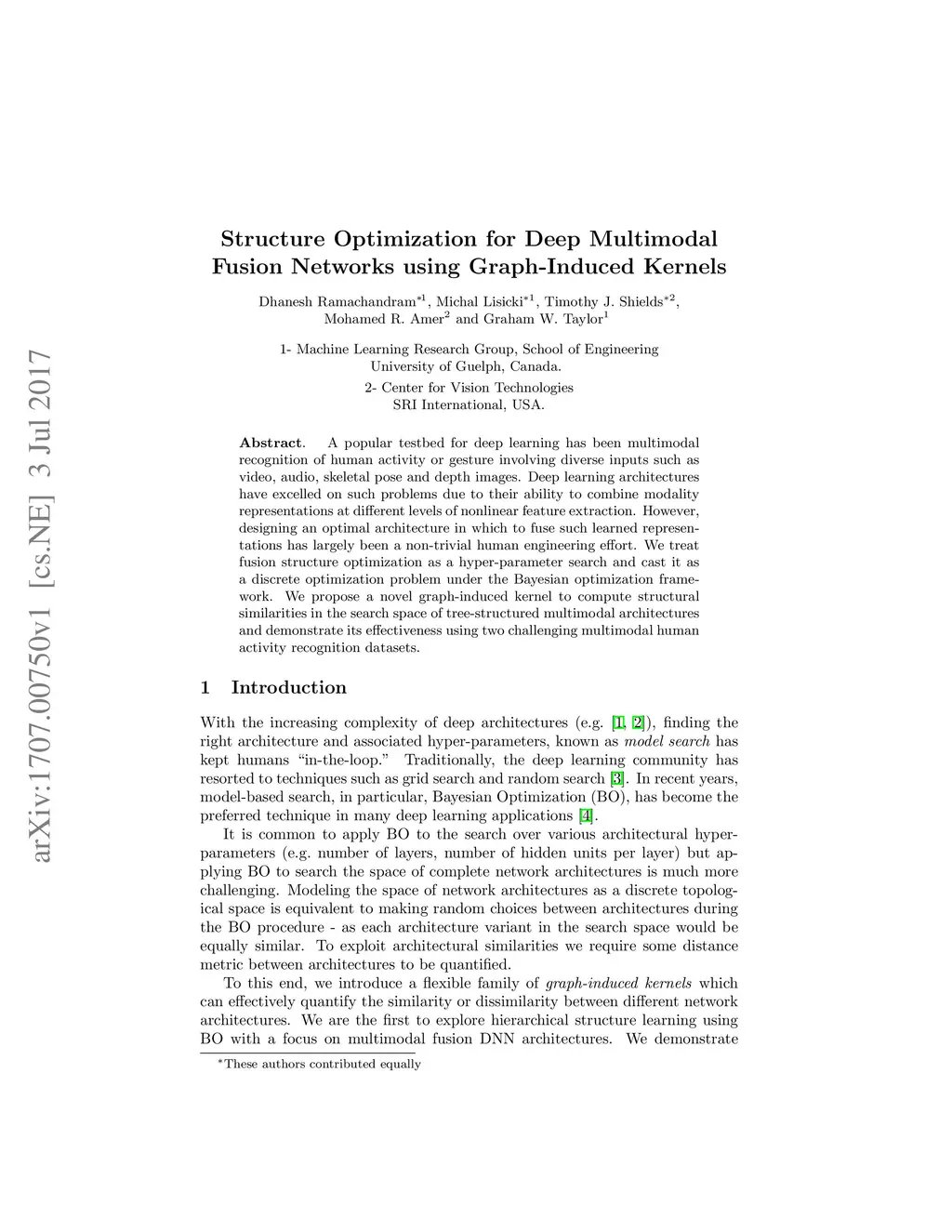 A popular testbed for deep learning has been multimodal recognition of human activity or gesture involving diverse inputs such as video, audio, skeletal pose and depth images. Deep learning architectures have excelled on such problems due to their ability to combine modality representations at different levels of nonlinear feature extraction. However, designing an optimal architecture in which to fuse such learned representations has largely been a non-trivial human engineering effort. We treat fusion structure optimization as a hyper-parameter search and cast it as a discrete optimization problem under the Bayesian optimization framework. We propose a novel graph-induced kernel to compute structural similarities in the search space of tree-structured multimodal architectures and demonstrate its effectiveness using two challenging multimodal human activity recognition datasets.