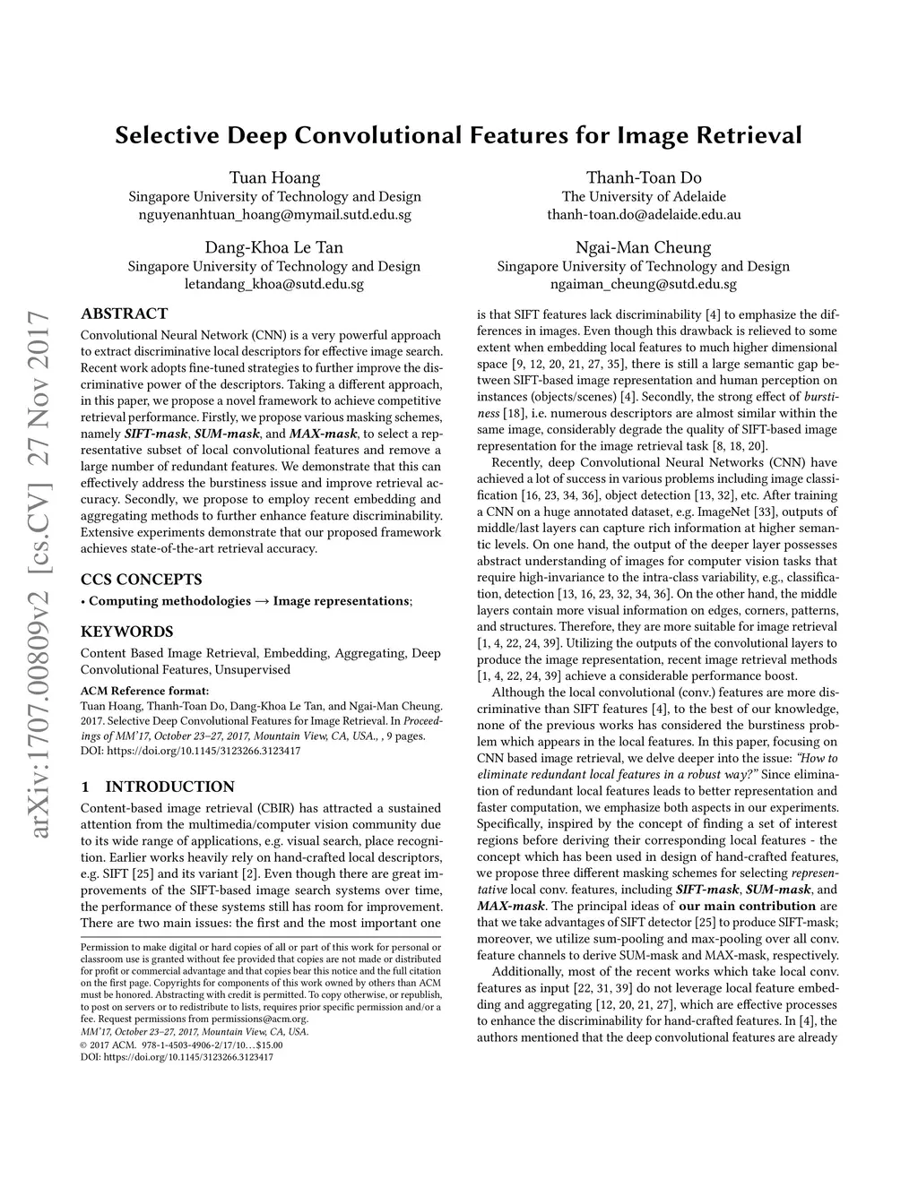 Convolutional Neural Network (CNN) is a very powerful approach to extract discriminative local descriptors for effective image search. Recent work adopts fine-tuned strategies to further improve the discriminative power of the descriptors. Taking a different approach, in this paper, we propose a novel framework to achieve competitive retrieval performance. Firstly, we propose various masking schemes, namely SIFT-mask, SUM-mask, and MAX-mask, to select a representative subset of local convolutional features and remove a large number of redundant features. We demonstrate that this can effectively address the burstiness issue and improve retrieval accuracy. Secondly, we propose to employ recent embedding and aggregating methods to further enhance feature discriminability. Extensive experiments demonstrate that our proposed framework achieves state-of-the-art retrieval accuracy.