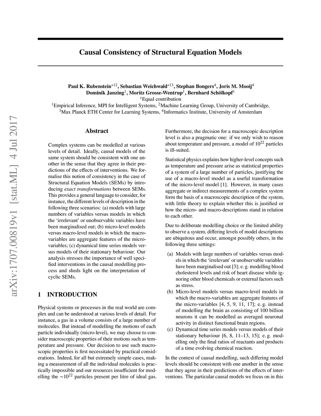 Complex systems can be modelled at various levels of detail. Ideally, causal models of the same system should be consistent with one another in the sense that they agree in their predictions of the effects of interventions. We formalise this notion of consistency in the case of Structural Equation Models (SEMs) by introducing exact transformations between SEMs. This provides a general language to consider, for instance, the different levels of description in the following three scenarios: (a) models with large numbers of variables versus models in which the `irrelevant' or unobservable variables have been marginalised out; (b) micro-level models versus macro-level models in which the macro-variables are aggregate features of the micro-variables; (c) dynamical time series models versus models of their stationary behaviour. Our analysis stresses the importance of well specified interventions in the causal modelling process and sheds light on the interpretation of cyclic SEMs.