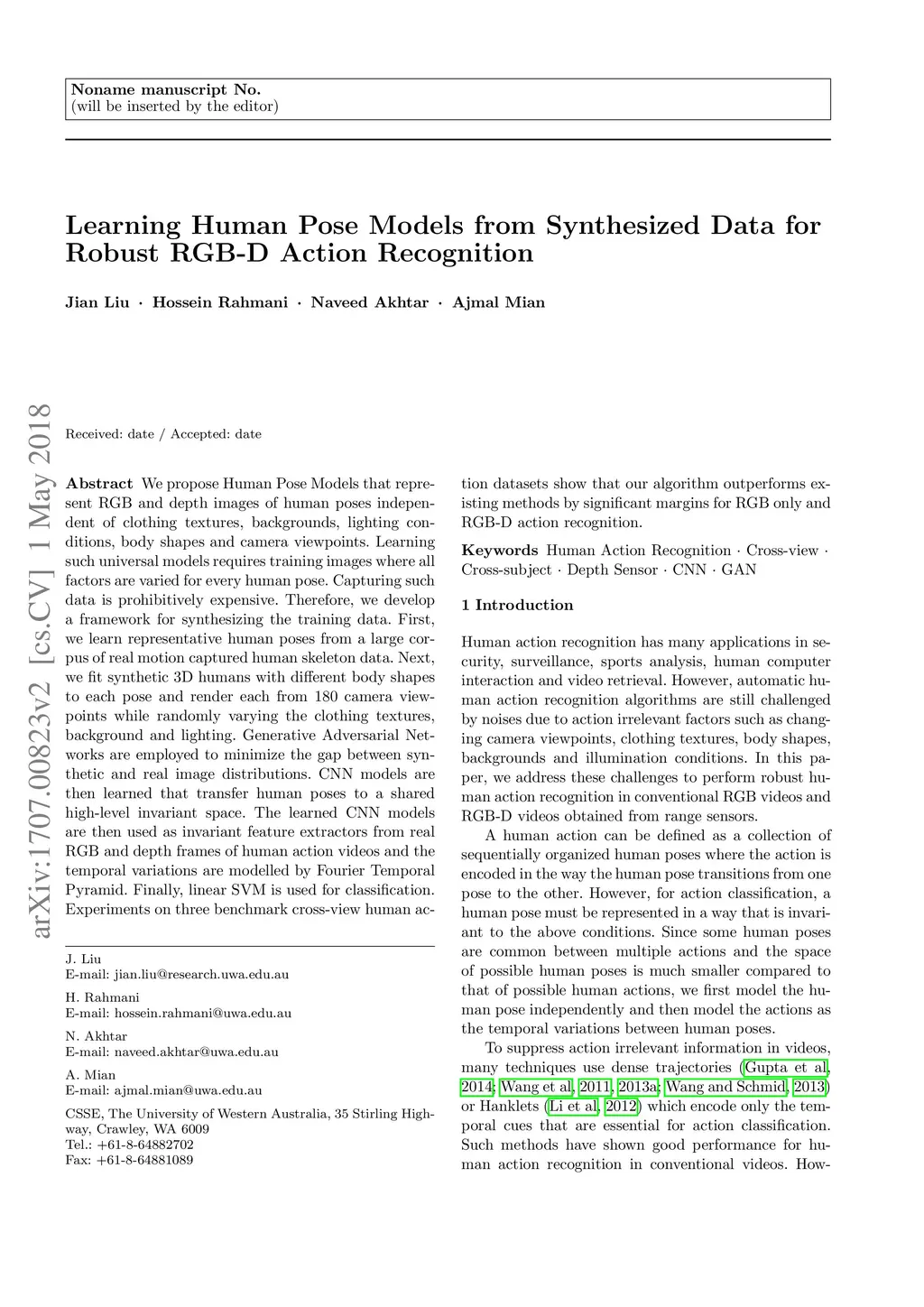 Learning Human Pose Models from Synthesized Data for Robust RGB-D Action