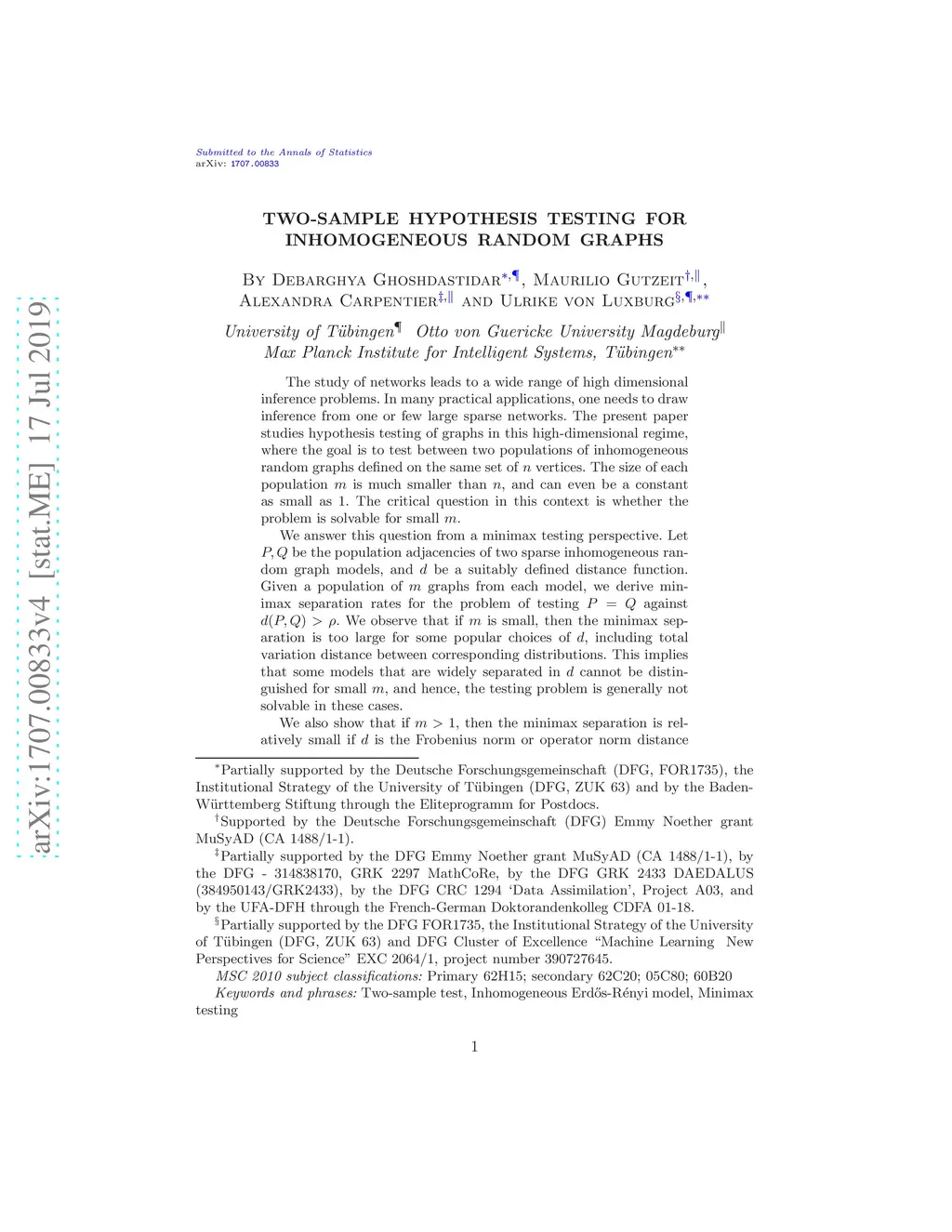 The study of networks leads to a wide range of high dimensional inference problems. In many practical applications, one needs to draw inference from one or few large sparse networks. The present paper studies hypothesis testing of graphs in this high-dimensional regime, where the goal is to test between two populations of inhomogeneous random graphs defined on the same set of vertices. The size of each population is much smaller than , and can even be a constant as small as 1. The critical question in this context is whether the problem is solvable for small . We answer this question from a minimax testing perspective. Let be the population adjacencies of two sparse inhomogeneous random graph models, and be a suitably defined distance function. Given a population of graphs from each model, we derive minimax separation rates for the problem of testing against . We observe that if is small, then the minimax separation is too large for some popular choices of , including total variation distance between corresponding distributions. This implies that some models that are widely separated in cannot be distinguished for small , and hence, the testing problem is generally not solvable in these cases. We also show that if , then the minimax separation is relatively small if is the Frobenius norm or operator norm distance between and . For , only the latter distance provides small minimax separation. Thus, for these distances, the problem is solvable for small . We also present near-optimal two-sample tests in both cases, where tests are adaptive with respect to sparsity level of the graphs.