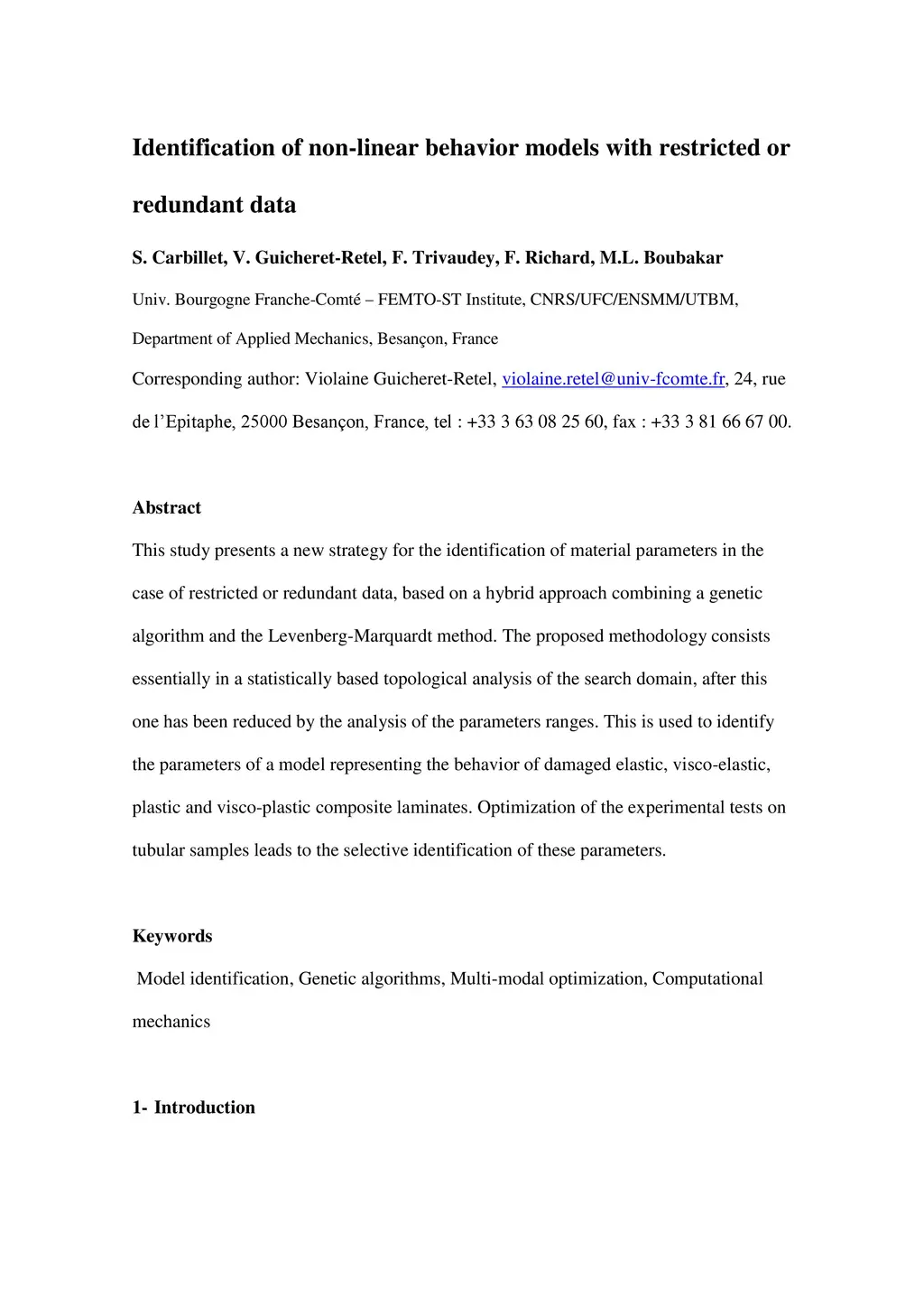 This study presents a new strategy for the identification of material parameters in the case of restricted or redundant data, based on a hybrid approach combining a genetic algorithm and the Levenberg-Marquardt method. The proposed methodology consists essentially in a statistically based topological analysis of the search domain, after this one has been reduced by the analysis of the parameters ranges. This is used to identify the parameters of a model representing the behavior of damaged elastic, visco-elastic, plastic and visco-plastic composite laminates. Optimization of the experimental tests on tubular samples leads to the selective identification of these parameters.