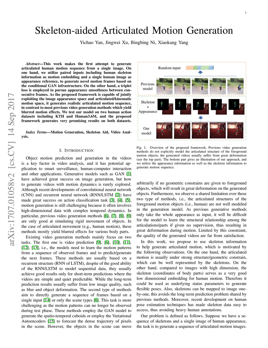 This work make the first attempt to generate articulated human motion sequence from a single image. On the one hand, we utilize paired inputs including human skeleton information as motion embedding and a single human image as appearance reference, to generate novel motion frames, based on the conditional GAN infrastructure. On the other hand, a triplet loss is employed to pursue appearance-smoothness between consecutive frames. As the proposed framework is capable of jointly exploiting the image appearance space and articulated/kinematic motion space, it generates realistic articulated motion sequence, in contrast to most previous video generation methods which yield blurred motion effects. We test our model on two human action datasets including KTH and Human3.6M, and the proposed framework generates very promising results on both datasets.