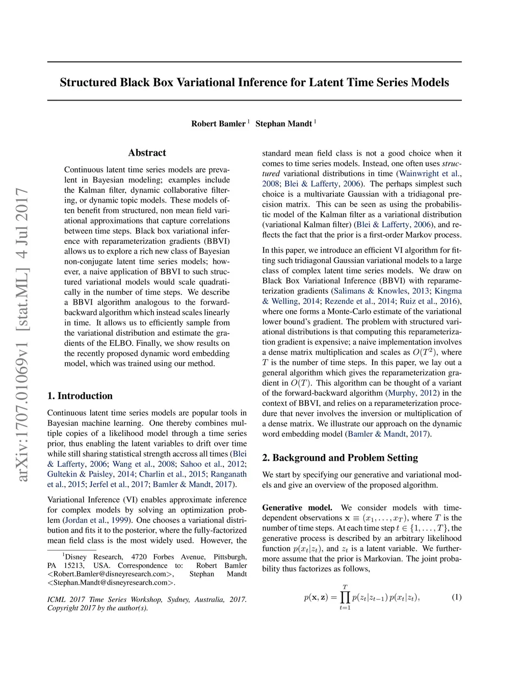 Continuous latent time series models are prevalent in Bayesian modeling; examples include the Kalman filter, dynamic collaborative filtering, or dynamic topic models. These models often benefit from structured, non mean field variational approximations that capture correlations between time steps. Black box variational inference with reparameterization gradients (BBVI) allows us to explore a rich new class of Bayesian non-conjugate latent time series models; however, a naive application of BBVI to such structured variational models would scale quadratically in the number of time steps. We describe a BBVI algorithm analogous to the forward-backward algorithm which instead scales linearly in time. It allows us to efficiently sample from the variational distribution and estimate the gradients of the ELBO. Finally, we show results on the recently proposed dynamic word embedding model, which was trained using our method.