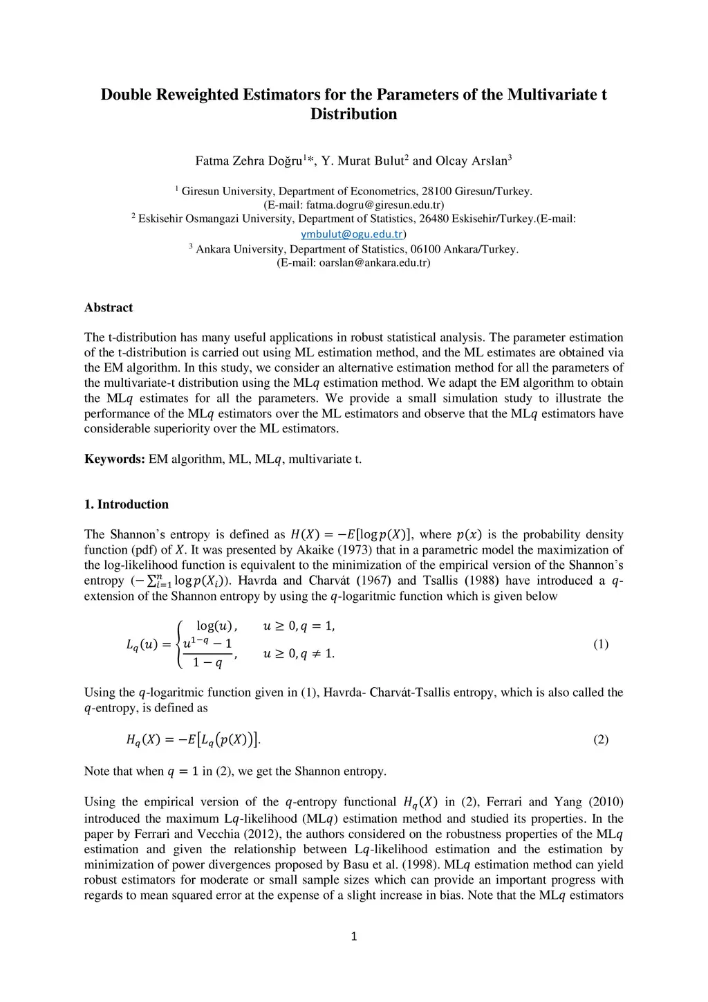 Double Reweighted Estimators for the Parameters of the Multivariate t
