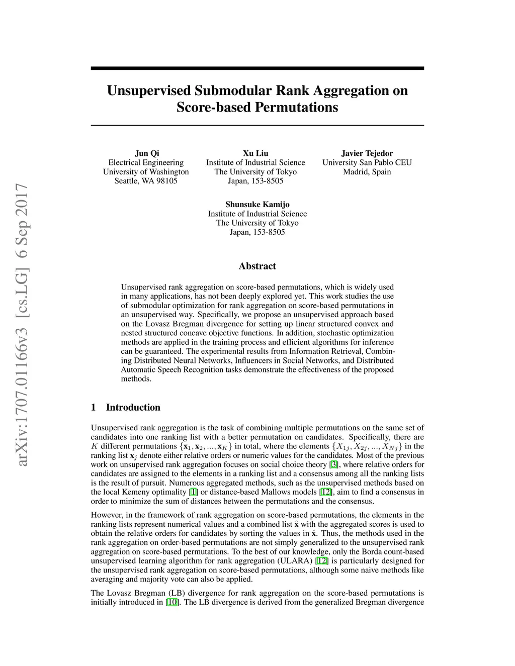 Unsupervised rank aggregation on score-based permutations, which is widely used in many applications, has not been deeply explored yet. This work studies the use of submodular optimization for rank aggregation on score-based permutations in an unsupervised way. Specifically, we propose an unsupervised approach based on the Lovasz Bregman divergence for setting up linear structured convex and nested structured concave objective functions. In addition, stochastic optimization methods are applied in the training process and efficient algorithms for inference can be guaranteed. The experimental results from Information Retrieval, Combining Distributed Neural Networks, Influencers in Social Networks, and Distributed Automatic Speech Recognition tasks demonstrate the effectiveness of the proposed methods.