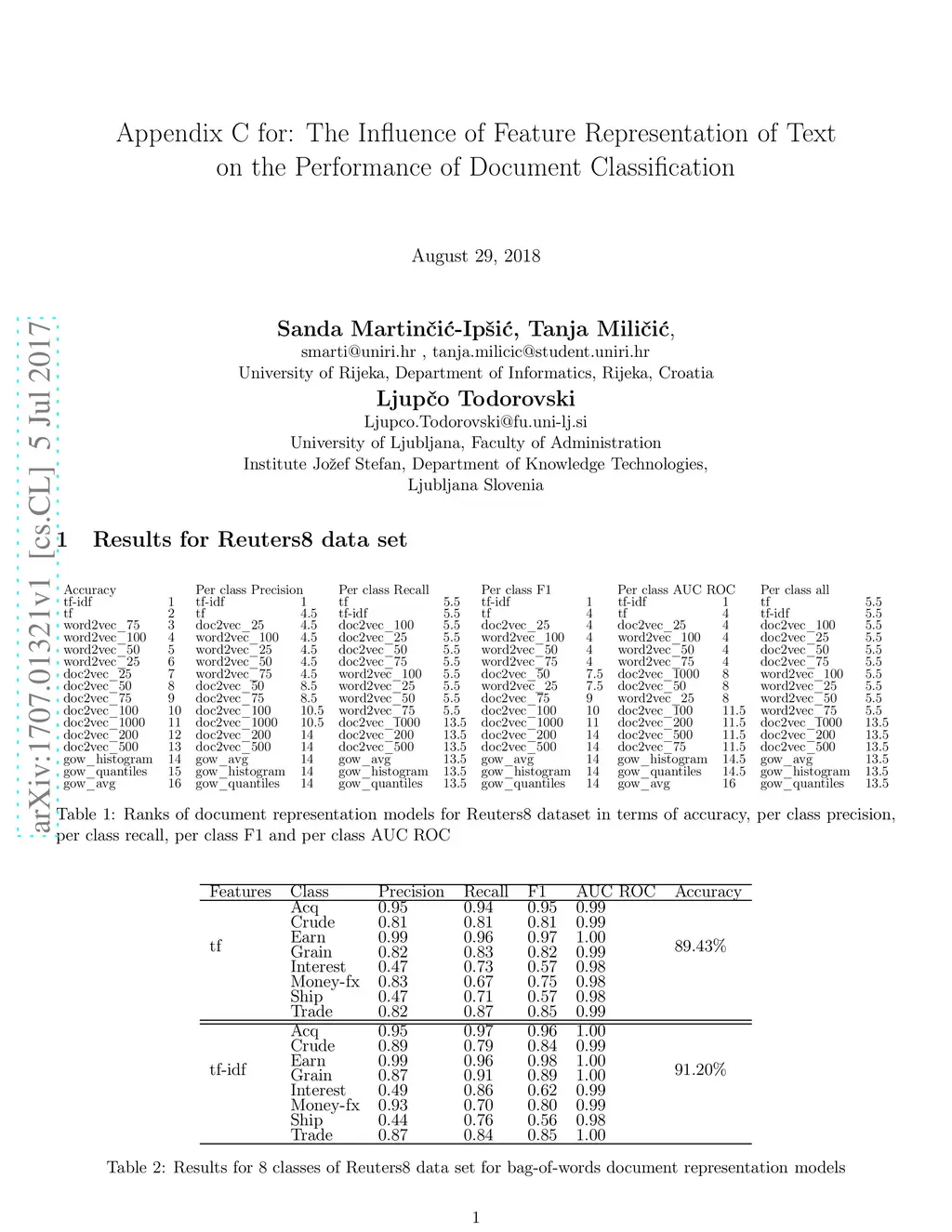 In this paper we perform a comparative analysis of three models for feature representation of text documents in the context of document classification. In particular, we consider the most often used family of models bag-of-words, recently proposed continuous space models word2vec and doc2vec, and the model based on the representation of text documents as language networks. While the bag-of-word models have been extensively used for the document classification task, the performance of the other two models for the same task have not been well understood. This is especially true for the network-based model that have been rarely considered for representation of text documents for classification. In this study, we measure the performance of the document classifiers trained using the method of random forests for features generated the three models and their variants. The results of the empirical comparison show that the commonly used bag-of-words model has performance comparable to the one obtained by the emerging continuous-space model of doc2vec. In particular, the low-dimensional variants of doc2vec generating up to 75 features are among the top-performing document representation models. The results finally point out that doc2vec shows a superior performance in the tasks of classifying large documents.