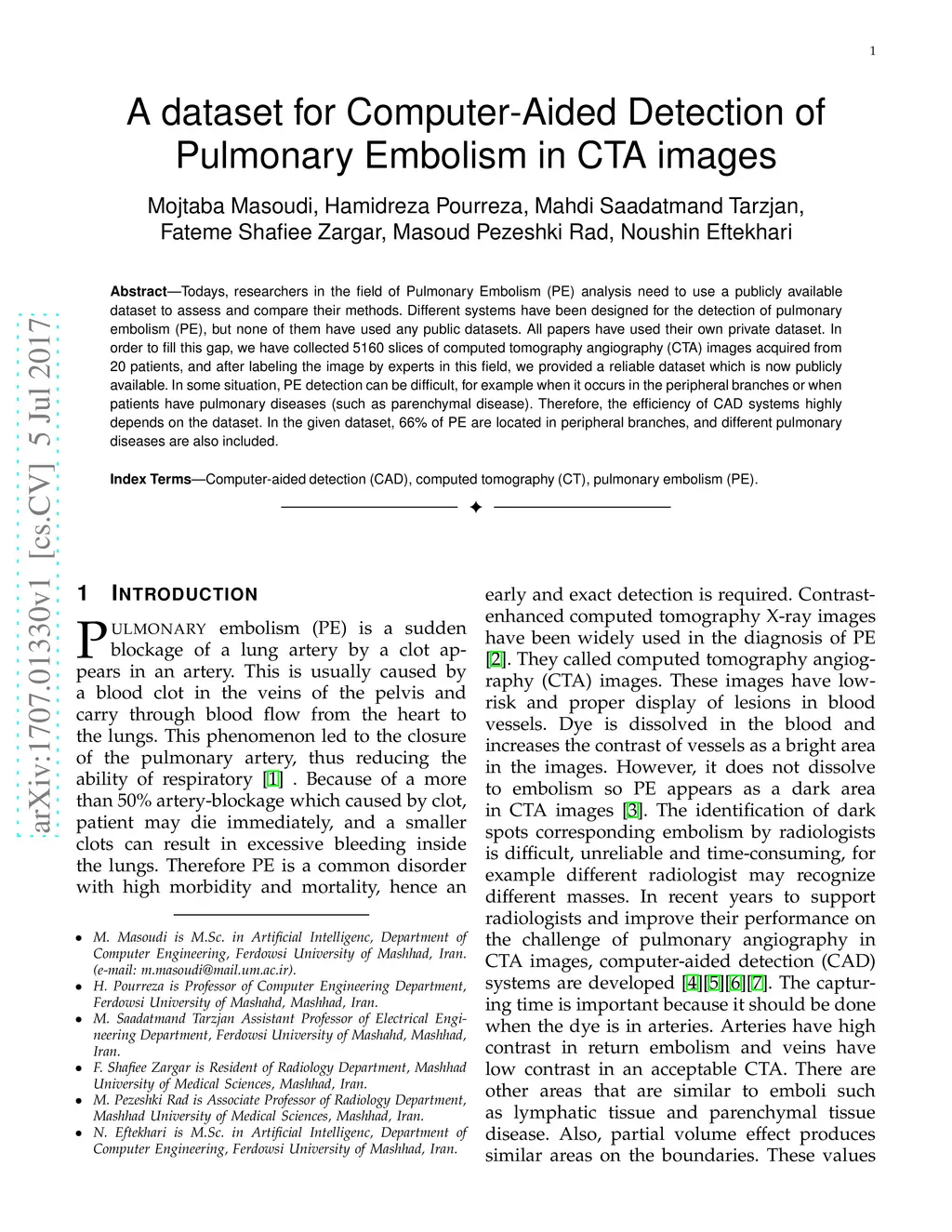 Todays, researchers in the field of Pulmonary Embolism (PE) analysis need to use a publicly available dataset to assess and compare their methods. Different systems have been designed for the detection of pulmonary embolism (PE), but none of them have used any public datasets. All papers have used their own private dataset. In order to fill this gap, we have collected 5160 slices of computed tomography angiography (CTA) images acquired from 20 patients, and after labeling the image by experts in this field, we provided a reliable dataset which is now publicly available. In some situation, PE detection can be difficult, for example when it occurs in the peripheral branches or when patients have pulmonary diseases (such as parenchymal disease). Therefore, the efficiency of CAD systems highly depends on the dataset. In the given dataset, 66% of PE are located in peripheral branches, and different pulmonary diseases are also included.