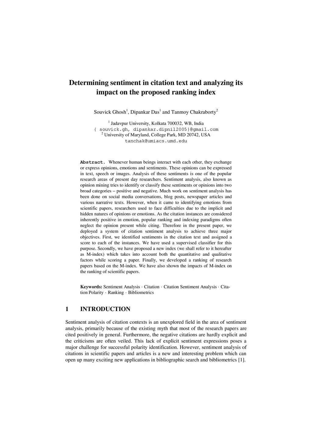 Whenever human beings interact with each other, they exchange or express opinions, emotions, and sentiments. These opinions can be expressed in text, speech or images. Analysis of these sentiments is one of the popular research areas of present day researchers. Sentiment analysis, also known as opinion mining tries to identify or classify these sentiments or opinions into two broad categories - positive and negative. In recent years, the scientific community has taken a lot of interest in analyzing sentiment in textual data available in various social media platforms. Much work has been done on social media conversations, blog posts, newspaper articles and various narrative texts. However, when it comes to identifying emotions from scientific papers, researchers have faced some difficulties due to the implicit and hidden nature of opinion. By default, citation instances are considered inherently positive in emotion. Popular ranking and indexing paradigms often neglect the opinion present while citing. In this paper, we have tried to achieve three objectives. First, we try to identify the major sentiment in the citation text and assign a score to the instance. We have used a statistical classifier for this purpose. Secondly, we have proposed a new index (we shall refer to it hereafter as M-index) which takes into account both the quantitative and qualitative factors while scoring a paper. Thirdly, we developed a ranking of research papers based on the M-index. We also try to explain how the M-index impacts the ranking of scientific papers.