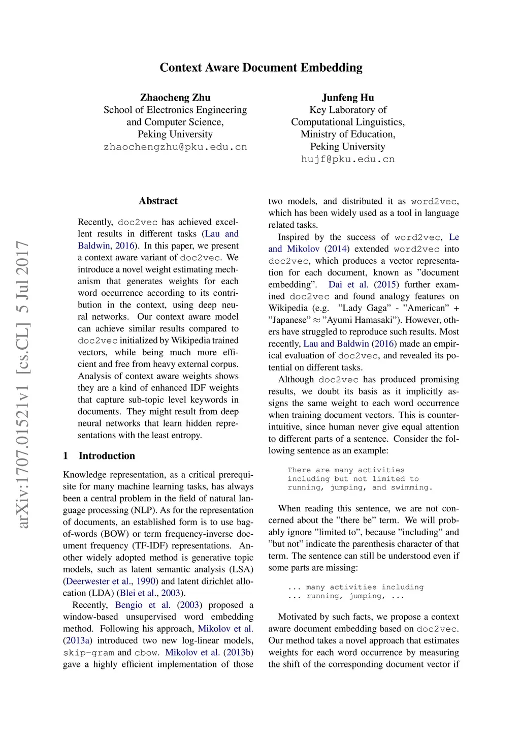 Recently, doc2vec has achieved excellent results in different tasks. In this paper, we present a context aware variant of doc2vec. We introduce a novel weight estimating mechanism that generates weights for each word occurrence according to its contribution in the context, using deep neural networks. Our context aware model can achieve similar results compared to doc2vec initialized byWikipedia trained vectors, while being much more efficient and free from heavy external corpus. Analysis of context aware weights shows they are a kind of enhanced IDF weights that capture sub-topic level keywords in documents. They might result from deep neural networks that learn hidden representations with the least entropy.