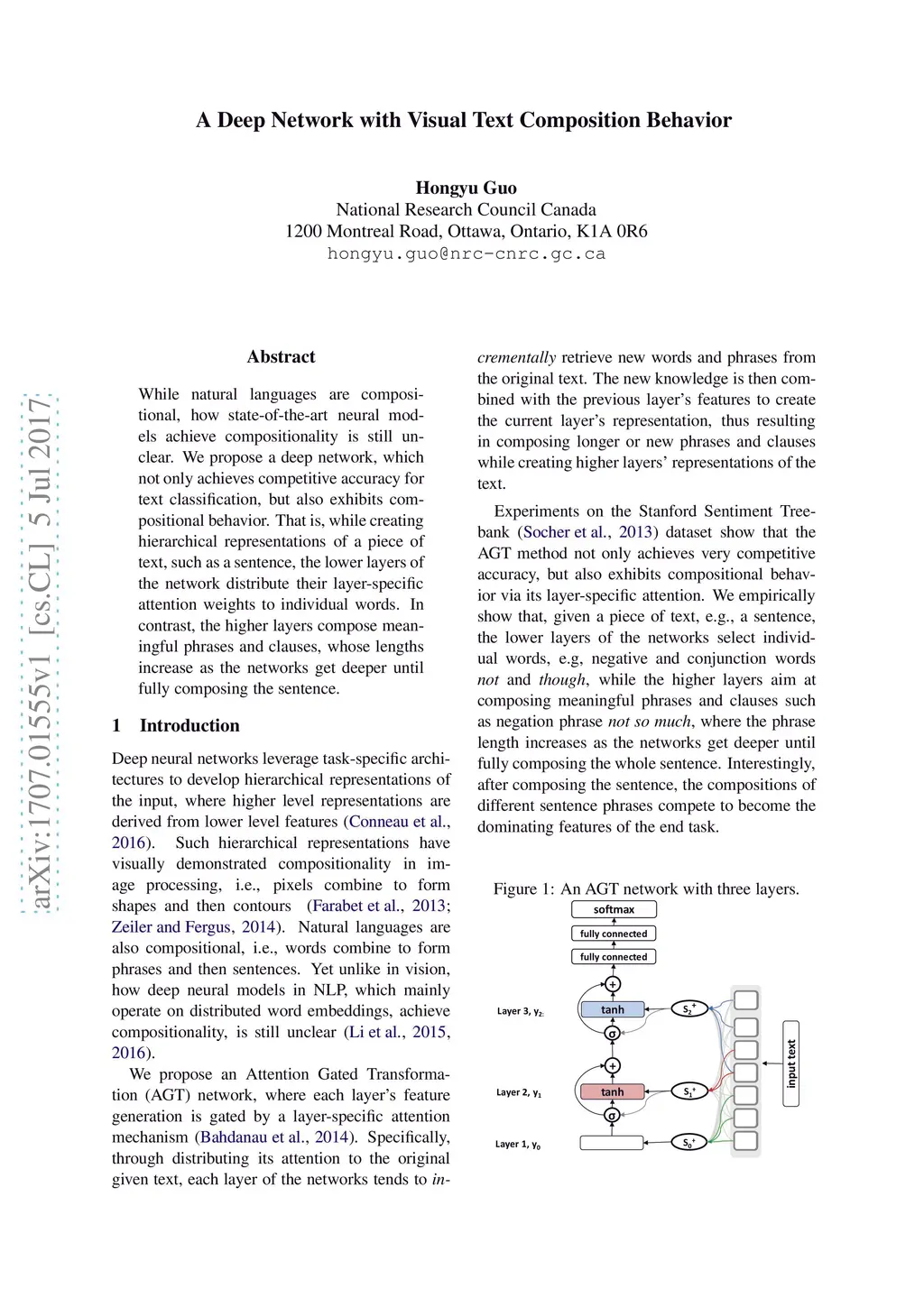While natural languages are compositional, how state-of-the-art neural models achieve compositionality is still unclear. We propose a deep network, which not only achieves competitive accuracy for text classification, but also exhibits compositional behavior. That is, while creating hierarchical representations of a piece of text, such as a sentence, the lower layers of the network distribute their layer-specific attention weights to individual words. In contrast, the higher layers compose meaningful phrases and clauses, whose lengths increase as the networks get deeper until fully composing the sentence.
