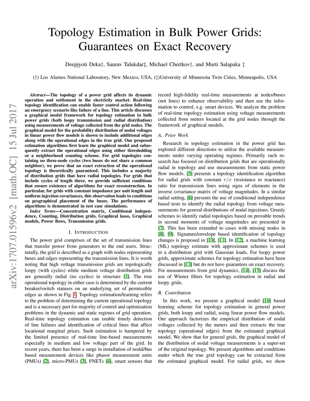 The topology of a power grid affects its dynamic operation and settlement in the electricity market. Real-time topology identification can enable faster control action following an emergency scenario like failure of a line. This article discusses a graphical model framework for topology estimation in bulk power grids (both loopy transmission and radial distribution) using measurements of voltage collected from the grid nodes. The graphical model for the probability distribution of nodal voltages in linear power flow models is shown to include additional edges along with the operational edges in the true grid. Our proposed estimation algorithms first learn the graphical model and subsequently extract the operational edges using either thresholding or a neighborhood counting scheme. For grid topologies containing no three-node cycles (two buses do not share a common neighbor), we prove that an exact extraction of the operational topology is theoretically guaranteed. This includes a majority of distribution grids that have radial topologies. For grids that include cycles of length three, we provide sufficient conditions that ensure existence of algorithms for exact reconstruction. In particular, for grids with constant impedance per unit length and uniform injection covariances, this observation leads to conditions on geographical placement of the buses. The performance of algorithms is demonstrated in test case simulations.