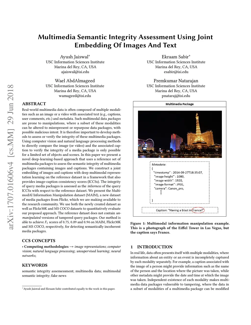 Multimedia Semantic Integrity Assessment Using Joint Embedding Of Images