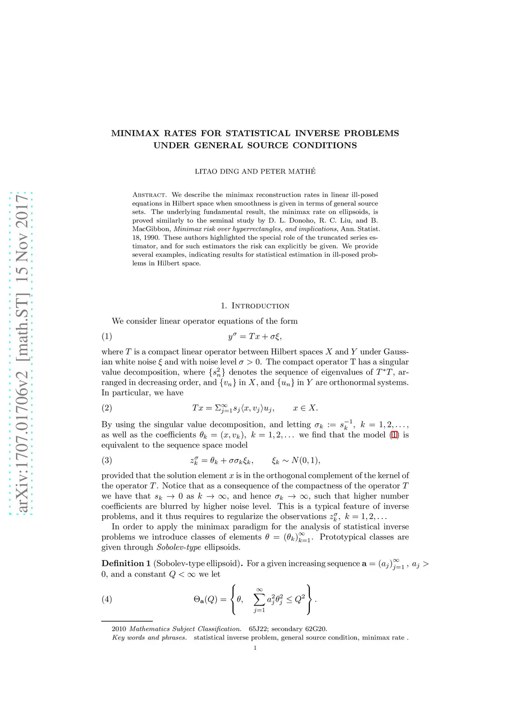 We describe the minimax reconstruction rates in linear ill-posed equations in Hilbert space when smoothness is given in terms of general source sets. The underlying fundamental result, the minimax rate on ellipsoids, is proved similarly to the seminal study by D. L. Donoho, R.~C. Liu, and B. MacGibbon, {\it Minimax risk over hyperrectangles, and implications}, Ann.~ Statist. 18, 1990. These authors highlighted the special role of the truncated series estimator, and for such estimators the risk can explicitly be given. We provide several examples, indicating results for statistical estimation in ill-posed problems in Hilbert space.