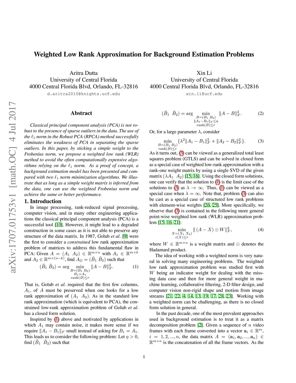 Classical principal component analysis (PCA) is not robust to the presence of sparse outliers in the data. The use of the norm in the Robust PCA (RPCA) method successfully eliminates the weakness of PCA in separating the sparse outliers. In this paper, by sticking a simple weight to the Frobenius norm, we propose a weighted low rank (WLR) method to avoid the often computationally expensive algorithms relying on the norm. As a proof of concept, a background estimation model has been presented and compared with two norm minimization algorithms. We illustrate that as long as a simple weight matrix is inferred from the data, one can use the weighted Frobenius norm and achieve the same or better performance.