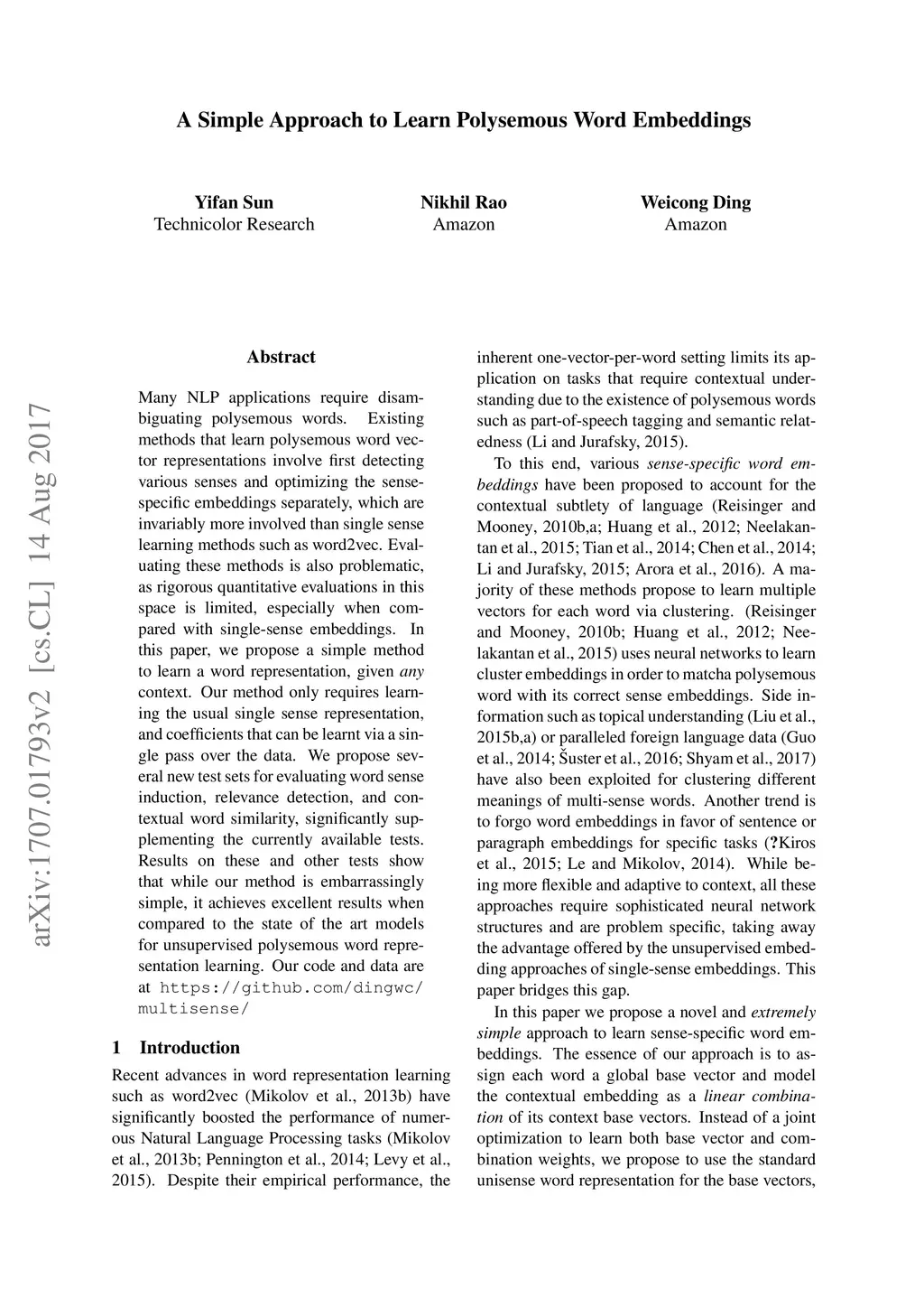 Many NLP applications require disambiguating polysemous words. Existing methods that learn polysemous word vector representations involve first detecting various senses and optimizing the sense-specific embeddings separately, which are invariably more involved than single sense learning methods such as word2vec. Evaluating these methods is also problematic, as rigorous quantitative evaluations in this space is limited, especially when compared with single-sense embeddings. In this paper, we propose a simple method to learn a word representation, given any context. Our method only requires learning the usual single sense representation, and coefficients that can be learnt via a single pass over the data. We propose several new test sets for evaluating word sense induction, relevance detection, and contextual word similarity, significantly supplementing the currently available tests. Results on these and other tests show that while our method is embarrassingly simple, it achieves excellent results when compared to the state of the art models for unsupervised polysemous word representation learning.