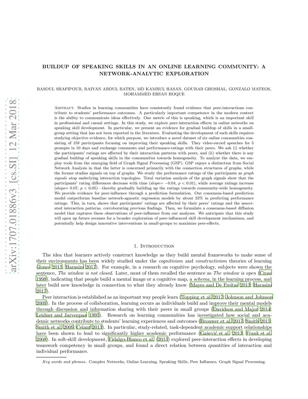 Learning communities have been shown to positively impact their participants' learning experiences. Research on learning communities and the associated peer effects have influenced decisions in many knowledge-spheres, from education to policy. However, little effort has been devoted to experimental studies that examine the impact of online interactions in characterizing how the knowledge of individual participants and the community as a whole shape up temporally. We introduce a framework called ROC Speak that we have developed towards collecting a novel dataset of six online public speaking learning communities; and use graph signal processing to elucidate the mechanism and implication of knowledge propagation therein. Using a novel total variation analysis framework, we show that participants converge to a similar increased performance level as a function of increased volume of online interactions; and that initially heterogeneous communities gradually approach knowledge homogeneity in their learners' speaking qualities. We formulate a simulation framework via consensus-based diffusion dynamics to model the observed knowledge accumulation and diffusion phenomena. At an individual level, we show that the learners' speaking qualities are impacted by the nature of their interactions. This is established by demonstrating that our proposed consensus-based prediction framework outperforms baseline network-agnostic regression models in estimating learning outcomes.