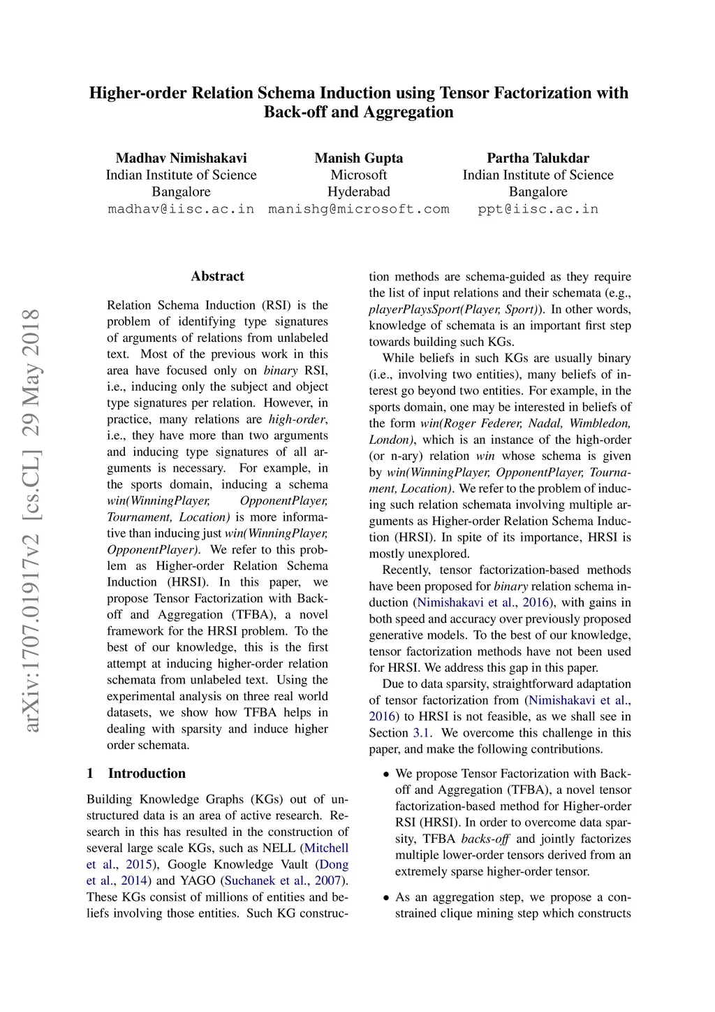 Relation Schema Induction (RSI) is the problem of identifying type signatures of arguments of relations from unlabeled text. Most of the previous work in this area have focused only on binary RSI, i.e., inducing only the subject and object type signatures per relation. However, in practice, many relations are high-order, i.e., they have more than two arguments and inducing type signatures of all arguments is necessary. For example, in the sports domain, inducing a schema win(WinningPlayer, OpponentPlayer, Tournament, Location) is more informative than inducing just win(WinningPlayer, OpponentPlayer). We refer to this problem as Higher-order Relation Schema Induction (HRSI). In this paper, we propose Tensor Factorization with Back-off and Aggregation (TFBA), a novel framework for the HRSI problem. To the best of our knowledge, this is the first attempt at inducing higher-order relation schemata from unlabeled text. Using the experimental analysis on three real world datasets, we show how TFBA helps in dealing with sparsity and induce higher order schemata.