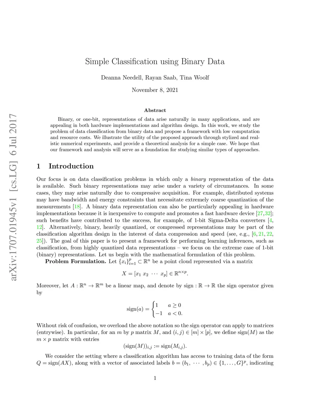 Binary, or one-bit, representations of data arise naturally in many applications, and are appealing in both hardware implementations and algorithm design. In this work, we study the problem of data classification from binary data and propose a framework with low computation and resource costs. We illustrate the utility of the proposed approach through stylized and realistic numerical experiments, and provide a theoretical analysis for a simple case. We hope that our framework and analysis will serve as a foundation for studying similar types of approaches.
