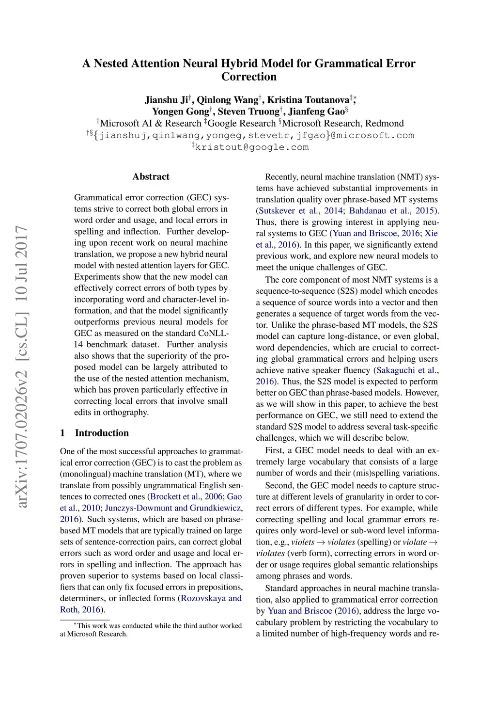A Nested Attention Neural Hybrid Model for Grammatical Error Correction