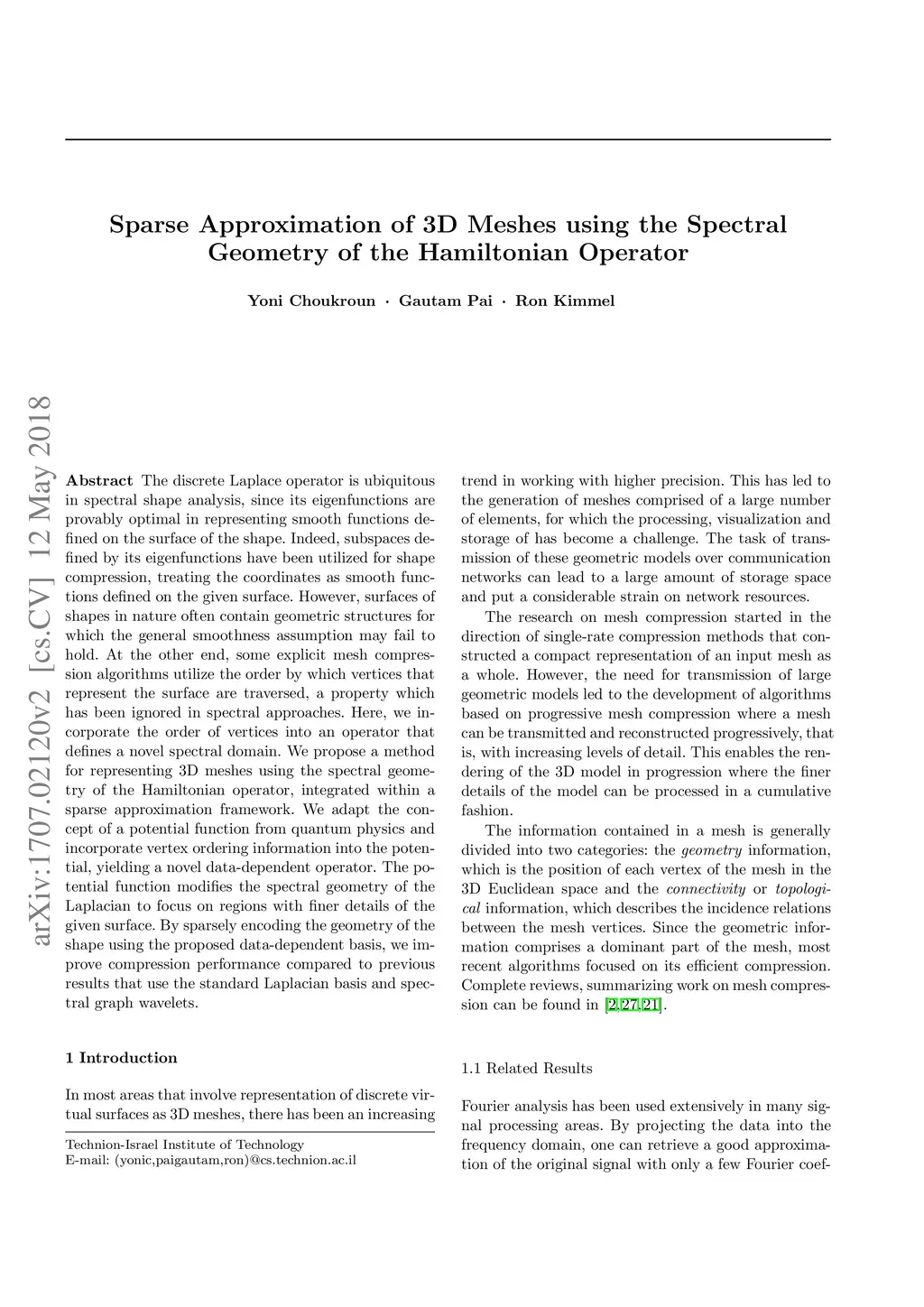 The discrete Laplace operator is ubiquitous in spectral shape analysis, since its eigenfunctions are provably optimal in representing smooth functions defined on the surface of the shape. Indeed, subspaces defined by its eigenfunctions have been utilized for shape compression, treating the coordinates as smooth functions defined on the given surface. However, surfaces of shapes in nature often contain geometric structures for which the general smoothness assumption may fail to hold. At the other end, some explicit mesh compression algorithms utilize the order by which vertices that represent the surface are traversed, a property which has been ignored in spectral approaches. Here, we incorporate the order of vertices into an operator that defines a novel spectral domain. We propose a method for representing 3D meshes using the spectral geometry of the Hamiltonian operator, integrated within a sparse approximation framework. We adapt the concept of a potential function from quantum physics and incorporate vertex ordering information into the potential, yielding a novel data-dependent operator. The potential function modifies the spectral geometry of the Laplacian to focus on regions with finer details of the given surface. By sparsely encoding the geometry of the shape using the proposed data-dependent basis, we improve compression performance compared to previous results that use the standard Laplacian basis and spectral graph wavelets.
