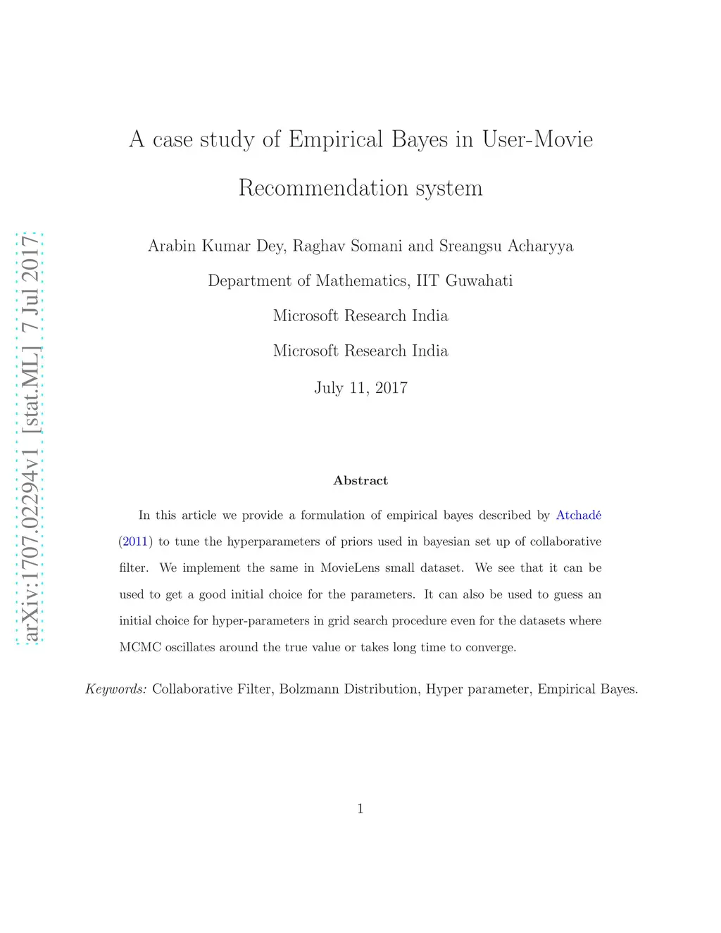 In this article we provide a formulation of empirical bayes described by Atchade (2011) to tune the hyperparameters of priors used in bayesian set up of collaborative filter. We implement the same in MovieLens small dataset. We see that it can be used to get a good initial choice for the parameters. It can also be used to guess an initial choice for hyper-parameters in grid search procedure even for the datasets where MCMC oscillates around the true value or takes long time to converge.