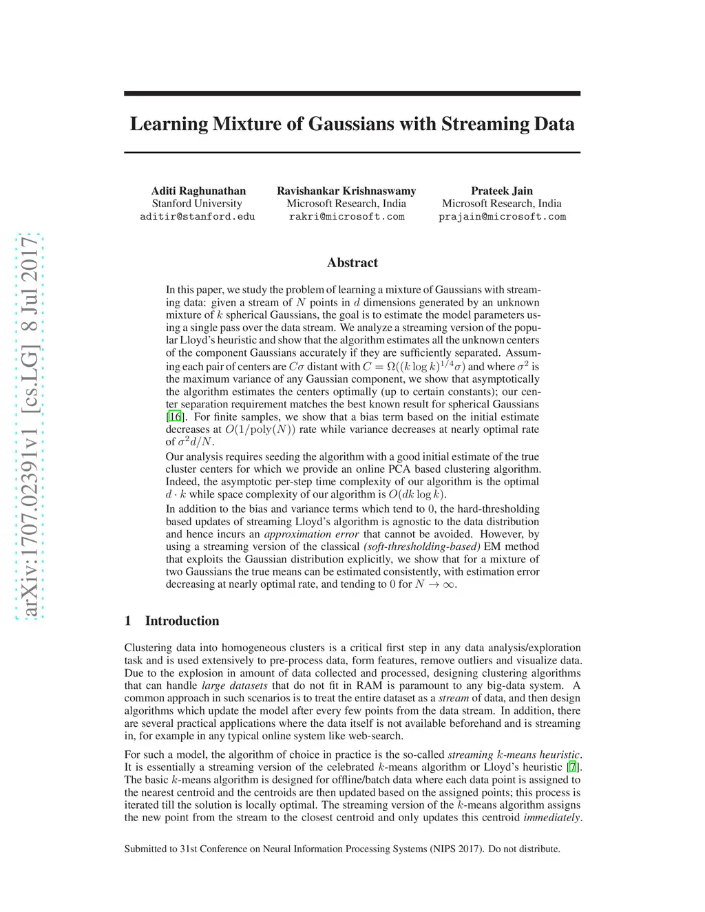 In this paper, we study the problem of learning a mixture of Gaussians with streaming data: given a stream of points in dimensions generated by an unknown mixture of spherical Gaussians, the goal is to estimate the model parameters using a single pass over the data stream. We analyze a streaming version of the popular Lloyd's heuristic and show that the algorithm estimates all the unknown centers of the component Gaussians accurately if they are sufficiently separated. Assuming each pair of centers are distant with and where is the maximum variance of any Gaussian component, we show that asymptotically the algorithm estimates the centers optimally (up to constants); our center separation requirement matches the best known result for spherical Gaussians \citep{vempalawang}. For finite samples, we show that a bias term based on the initial estimate decreases at rate while variance decreases at nearly optimal rate of . Our analysis requires seeding the algorithm with a good initial estimate of the true cluster centers for which we provide an online PCA based clustering algorithm. Indeed, the asymptotic per-step time complexity of our algorithm is the optimal while space complexity of our algorithm is . In addition to the bias and variance terms which tend to , the hard-thresholding based updates of streaming Lloyd's algorithm is agnostic to the data distribution and hence incurs an approximation error that cannot be avoided. However, by using a streaming version of the classical (soft-thresholding-based) EM method that exploits the Gaussian distribution explicitly, we show that for a mixture of two Gaussians the true means can be estimated consistently, with estimation error decreasing at nearly optimal rate, and tending to for .