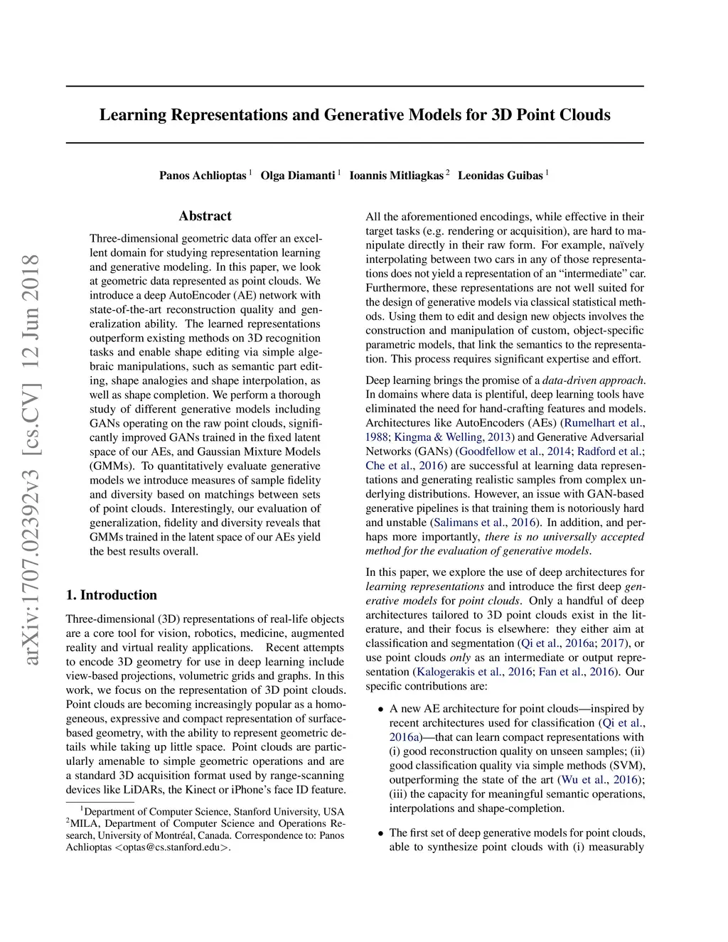 Three-dimensional geometric data offer an excellent domain for studying representation learning and generative modeling. In this paper, we look at geometric data represented as point clouds. We introduce a deep AutoEncoder (AE) network with state-of-the-art reconstruction quality and generalization ability. The learned representations outperform existing methods on 3D recognition tasks and enable shape editing via simple algebraic manipulations, such as semantic part editing, shape analogies and shape interpolation, as well as shape completion. We perform a thorough study of different generative models including GANs operating on the raw point clouds, significantly improved GANs trained in the fixed latent space of our AEs, and Gaussian Mixture Models (GMMs). To quantitatively evaluate generative models we introduce measures of sample fidelity and diversity based on matchings between sets of point clouds. Interestingly, our evaluation of generalization, fidelity and diversity reveals that GMMs trained in the latent space of our AEs yield the best results overall.