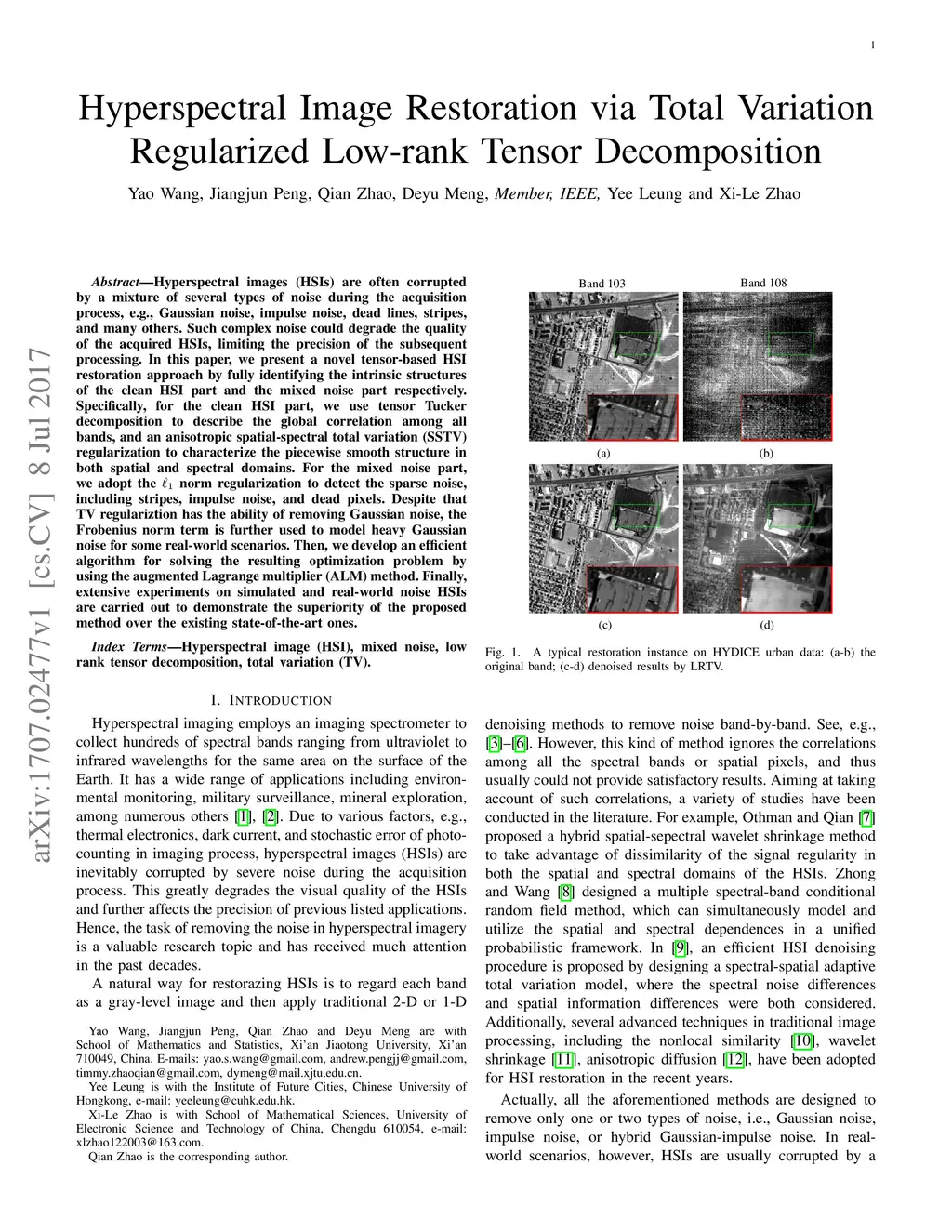 Hyperspectral Image Restoration via Total Variation Regularized Low-rank