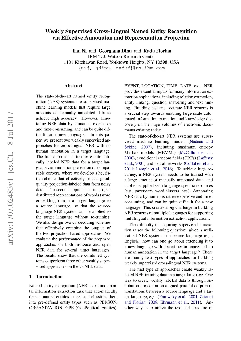The state-of-the-art named entity recognition (NER) systems are supervised machine learning models that require large amounts of manually annotated data to achieve high accuracy. However, annotating NER data by human is expensive and time-consuming, and can be quite difficult for a new language. In this paper, we present two weakly supervised approaches for cross-lingual NER with no human annotation in a target language. The first approach is to create automatically labeled NER data for a target language via annotation projection on comparable corpora, where we develop a heuristic scheme that effectively selects good-quality projection-labeled data from noisy data. The second approach is to project distributed representations of words (word embeddings) from a target language to a source language, so that the source-language NER system can be applied to the target language without re-training. We also design two co-decoding schemes that effectively combine the outputs of the two projection-based approaches. We evaluate the performance of the proposed approaches on both in-house and open NER data for several target languages. The results show that the combined systems outperform three other weakly supervised approaches on the CoNLL data.