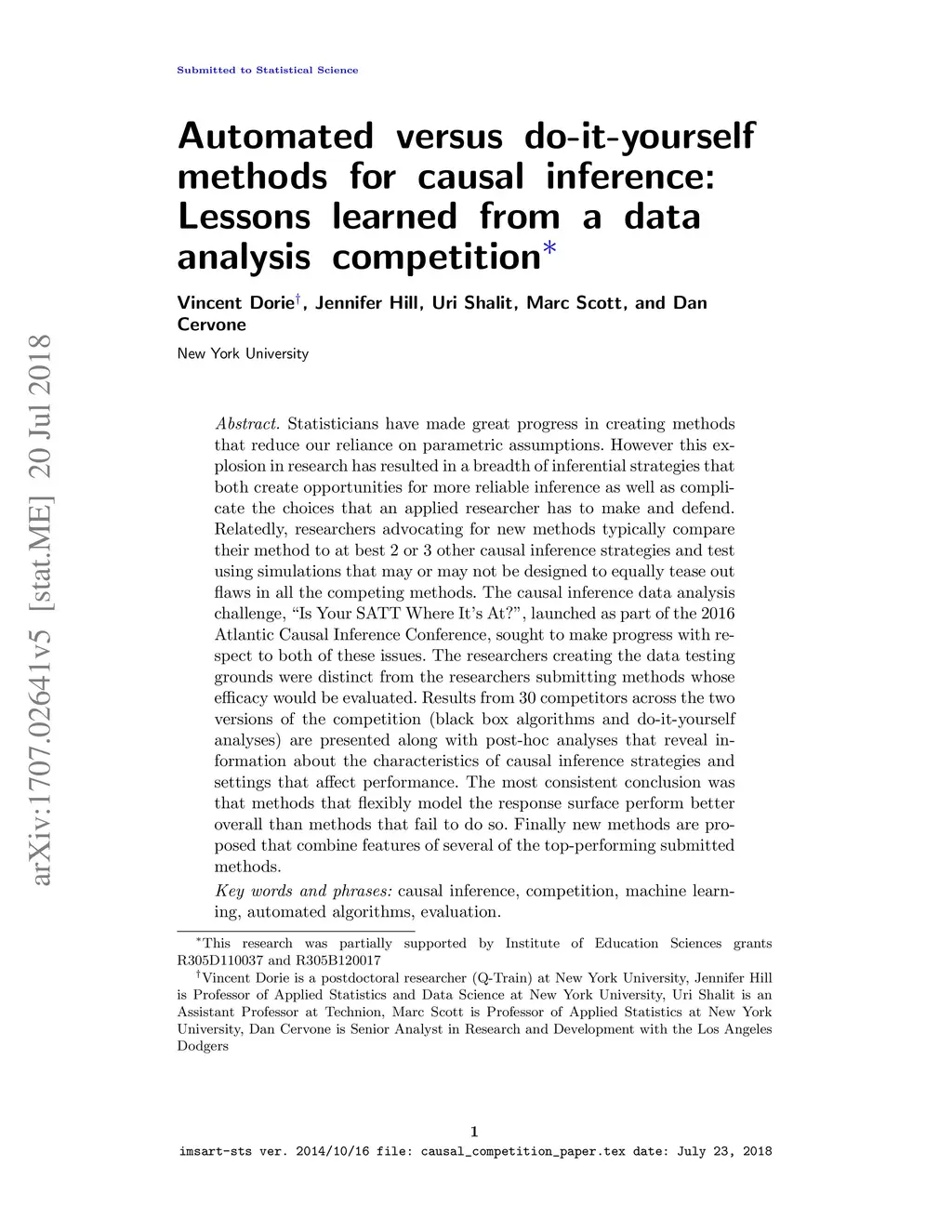 Statisticians have made great progress in creating methods that reduce our reliance on parametric assumptions. However this explosion in research has resulted in a breadth of inferential strategies that both create opportunities for more reliable inference as well as complicate the choices that an applied researcher has to make and defend. Relatedly, researchers advocating for new methods typically compare their method to at best 2 or 3 other causal inference strategies and test using simulations that may or may not be designed to equally tease out flaws in all the competing methods. The causal inference data analysis challenge, "Is Your SATT Where It's At?", launched as part of the 2016 Atlantic Causal Inference Conference, sought to make progress with respect to both of these issues. The researchers creating the data testing grounds were distinct from the researchers submitting methods whose efficacy would be evaluated. Results from 30 competitors across the two versions of the competition (black box algorithms and do-it-yourself analyses) are presented along with post-hoc analyses that reveal information about the characteristics of causal inference strategies and settings that affect performance. The most consistent conclusion was that methods that flexibly model the response surface perform better overall than methods that fail to do so. Finally new methods are proposed that combine features of several of the top-performing submitted methods.