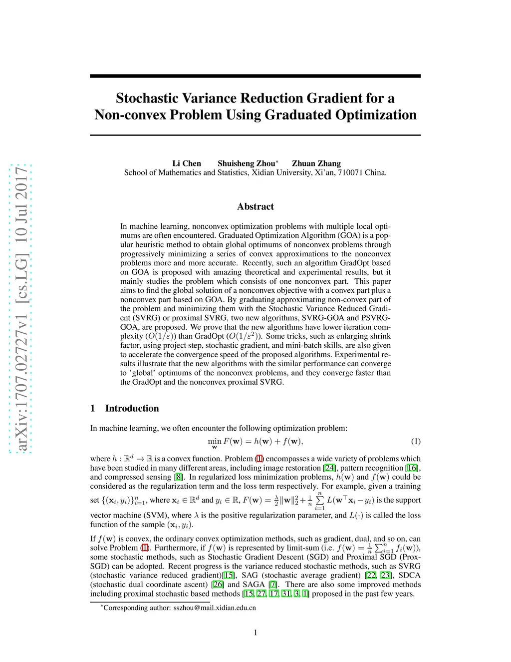In machine learning, nonconvex optimization problems with multiple local optimums are often encountered. Graduated Optimization Algorithm (GOA) is a popular heuristic method to obtain global optimums of nonconvex problems through progressively minimizing a series of convex approximations to the nonconvex problems more and more accurate. Recently, such an algorithm GradOpt based on GOA is proposed with amazing theoretical and experimental results, but it mainly studies the problem which consists of one nonconvex part. This paper aims to find the global solution of a nonconvex objective with a convex part plus a nonconvex part based on GOA. By graduating approximating non-convex part of the problem and minimizing them with the Stochastic Variance Reduced Gradient (SVRG) or proximal SVRG, two new algorithms, SVRG-GOA and PSVRG-GOA, are proposed. We prove that the new algorithms have lower iteration complexity () than GradOpt (). Some tricks, such as enlarging shrink factor, using project step, stochastic gradient, and mini-batch skills, are also given to accelerate the convergence speed of the proposed algorithms. Experimental results illustrate that the new algorithms with the similar performance can converge to 'global' optimums of the nonconvex problems, and they converge faster than the GradOpt and the nonconvex proximal SVRG.