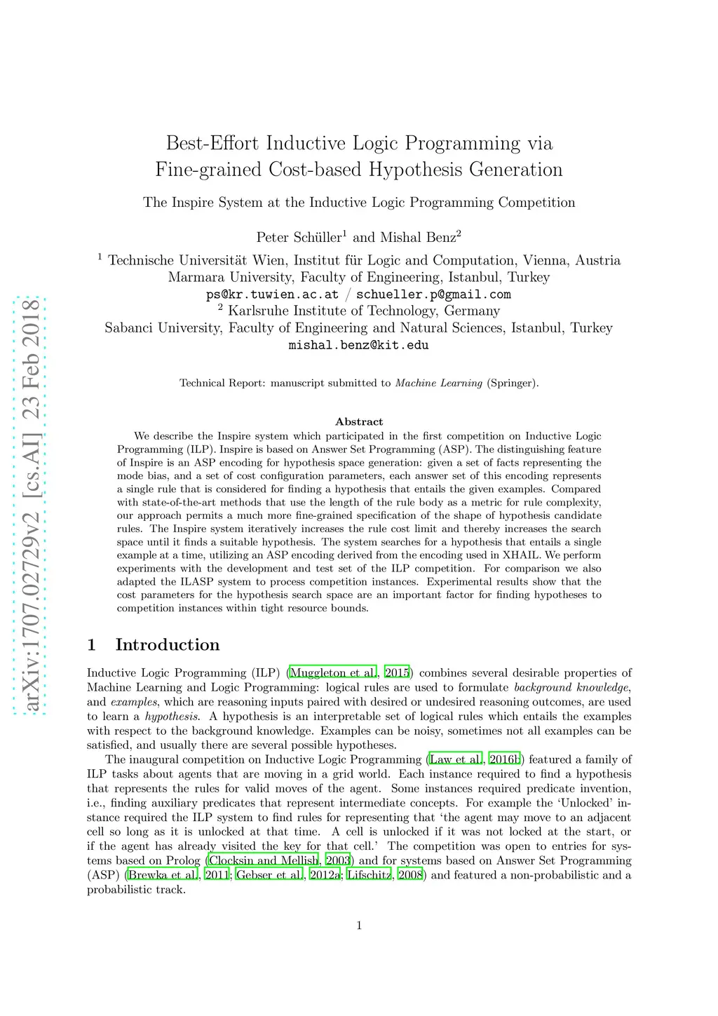 We describe the Inspire system which participated in the first competition on Inductive Logic Programming (ILP). Inspire is based on Answer Set Programming (ASP). The distinguishing feature of Inspire is an ASP encoding for hypothesis space generation: given a set of facts representing the mode bias, and a set of cost configuration parameters, each answer set of this encoding represents a single rule that is considered for finding a hypothesis that entails the given examples. Compared with state-of-the-art methods that use the length of the rule body as a metric for rule complexity, our approach permits a much more fine-grained specification of the shape of hypothesis candidate rules. The Inspire system iteratively increases the rule cost limit and thereby increases the search space until it finds a suitable hypothesis. The system searches for a hypothesis that entails a single example at a time, utilizing an ASP encoding derived from the encoding used in XHAIL. We perform experiments with the development and test set of the ILP competition. For comparison we also adapted the ILASP system to process competition instances. Experimental results show that the cost parameters for the hypothesis search space are an important factor for finding hypotheses to competition instances within tight resource bounds.