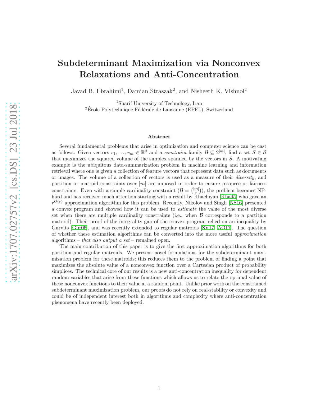 Several fundamental problems that arise in optimization and computer science can be cast as follows: Given vectors and a constraint family , find a set that maximizes the squared volume of the simplex spanned by the vectors in . A motivating example is the data-summarization problem in machine learning where one is given a collection of vectors that represent data such as documents or images. The volume of a set of vectors is used as a measure of their diversity, and partition or matroid constraints over are imposed in order to ensure resource or fairness constraints. Recently, Nikolov and Singh presented a convex program and showed how it can be used to estimate the value of the most diverse set when corresponds to a partition matroid. This result was recently extended to regular matroids in works of Straszak and Vishnoi, and Anari and Oveis Gharan. The question of whether these estimation algorithms can be converted into the more useful approximation algorithms -- that also output a set -- remained open. The main contribution of this paper is to give the first approximation algorithms for both partition and regular matroids. We present novel formulations for the subdeterminant maximization problem for these matroids; this reduces them to the problem of finding a point that maximizes the absolute value of a nonconvex function over a Cartesian product of probability simplices. The technical core of our results is a new anti-concentration inequality for dependent random variables that allows us to relate the optimal value of these nonconvex functions to their value at a random point. Unlike prior work on the constrained subdeterminant maximization problem, our proofs do not rely on real-stability or convexity and could be of independent interest both in algorithms and complexity.