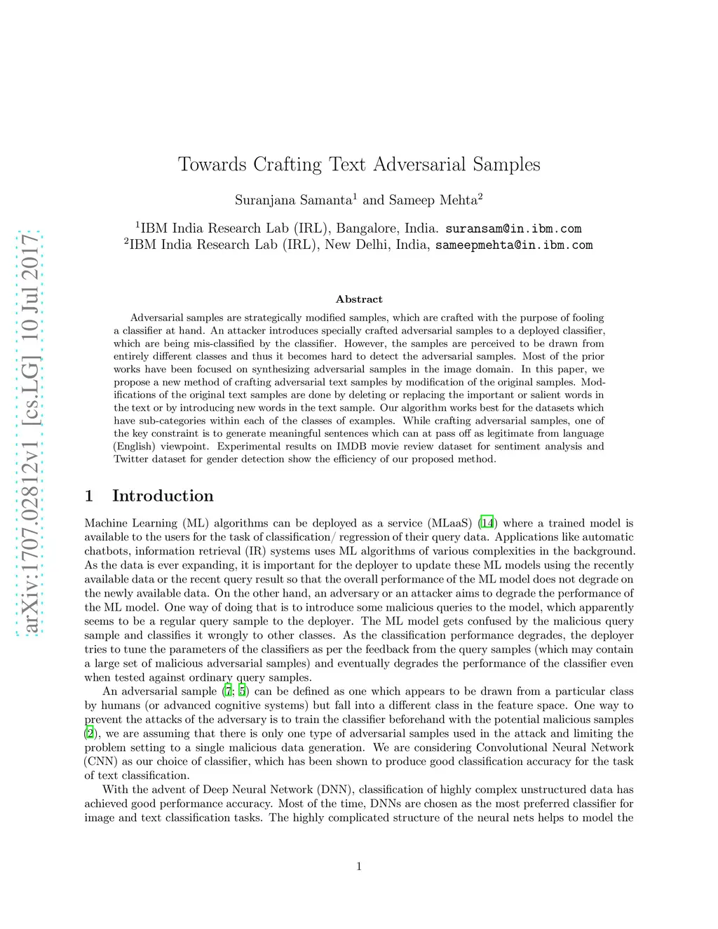 Adversarial samples are strategically modified samples, which are crafted with the purpose of fooling a classifier at hand. An attacker introduces specially crafted adversarial samples to a deployed classifier, which are being mis-classified by the classifier. However, the samples are perceived to be drawn from entirely different classes and thus it becomes hard to detect the adversarial samples. Most of the prior works have been focused on synthesizing adversarial samples in the image domain. In this paper, we propose a new method of crafting adversarial text samples by modification of the original samples. Modifications of the original text samples are done by deleting or replacing the important or salient words in the text or by introducing new words in the text sample. Our algorithm works best for the datasets which have sub-categories within each of the classes of examples. While crafting adversarial samples, one of the key constraint is to generate meaningful sentences which can at pass off as legitimate from language (English) viewpoint. Experimental results on IMDB movie review dataset for sentiment analysis and Twitter dataset for gender detection show the efficiency of our proposed method.