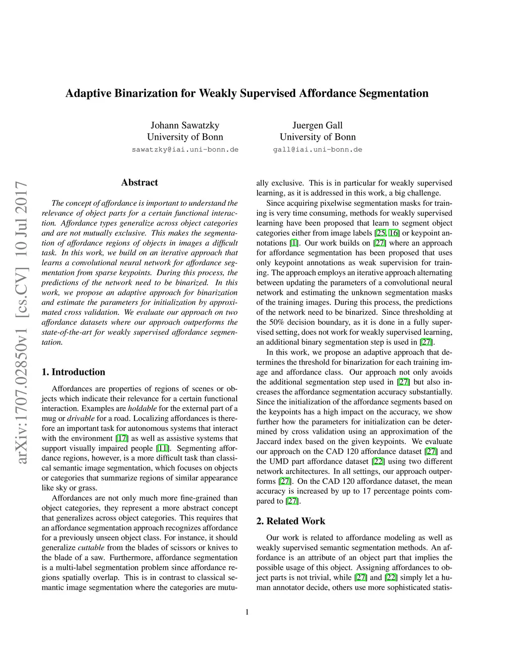 The concept of affordance is important to understand the relevance of object parts for a certain functional interaction. Affordance types generalize across object categories and are not mutually exclusive. This makes the segmentation of affordance regions of objects in images a difficult task. In this work, we build on an iterative approach that learns a convolutional neural network for affordance segmentation from sparse keypoints. During this process, the predictions of the network need to be binarized. In this work, we propose an adaptive approach for binarization and estimate the parameters for initialization by approximated cross validation. We evaluate our approach on two affordance datasets where our approach outperforms the state-of-the-art for weakly supervised affordance segmentation.