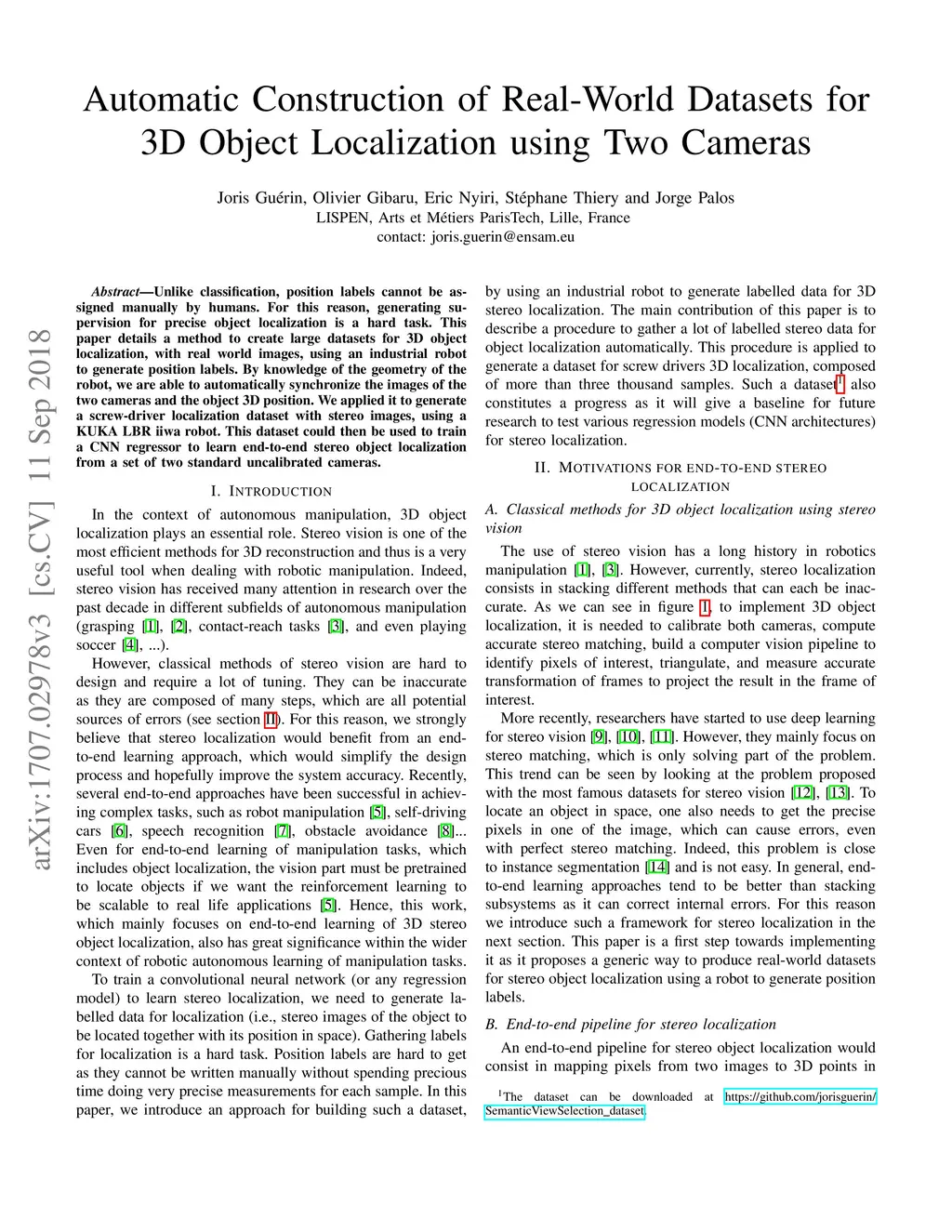 Unlike classification, position labels cannot be assigned manually by humans. For this reason, generating supervision for precise object localization is a hard task. This paper details a method to create large datasets for 3D object localization, with real world images, using an industrial robot to generate position labels. By knowledge of the geometry of the robot, we are able to automatically synchronize the images of the two cameras and the object 3D position. We applied it to generate a screw-driver localization dataset with stereo images, using a KUKA LBR iiwa robot. This dataset could then be used to train a CNN regressor to learn end-to-end stereo object localization from a set of two standard uncalibrated cameras.