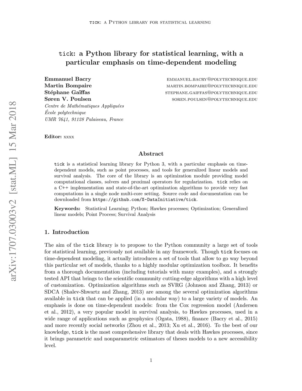 Tick is a statistical learning library for Python~3, with a particular emphasis on time-dependent models, such as point processes, and tools for generalized linear models and survival analysis. The core of the library is an optimization module providing model computational classes, solvers and proximal operators for regularization. tick relies on a C++ implementation and state-of-the-art optimization algorithms to provide very fast computations in a single node multi-core setting. Source code and documentation can be downloaded from https://github.com/X-DataInitiative/tick