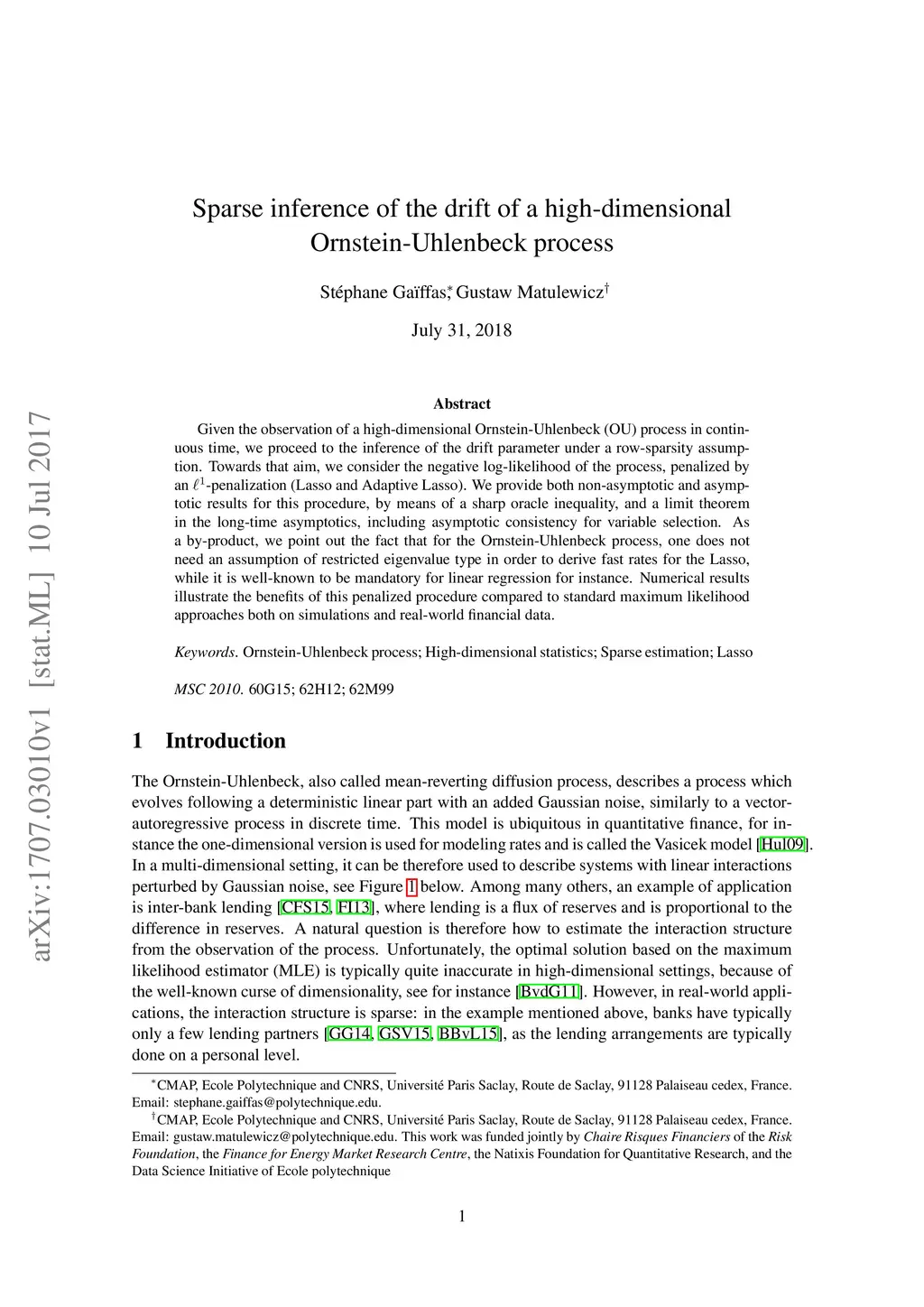 Given the observation of a high-dimensional Ornstein-Uhlenbeck (OU) process in continuous time, we proceed to the inference of the drift parameter under a row-sparsity assumption. Towards that aim, we consider the negative log-likelihood of the process, penalized by an -penalization (Lasso and Adaptive Lasso). We provide both non-asymptotic and asymptotic results for this procedure, by means of a sharp oracle inequality, and a limit theorem in the long-time asymptotics, including asymptotic consistency for variable selection. As a by-product, we point out the fact that for the Ornstein-Uhlenbeck process, one does not need an assumption of restricted eigenvalue type in order to derive fast rates for the Lasso, while it is well-known to be mandatory for linear regression for instance. Numerical results illustrate the benefits of this penalized procedure compared to standard maximum likelihood approaches both on simulations and real-world financial data.