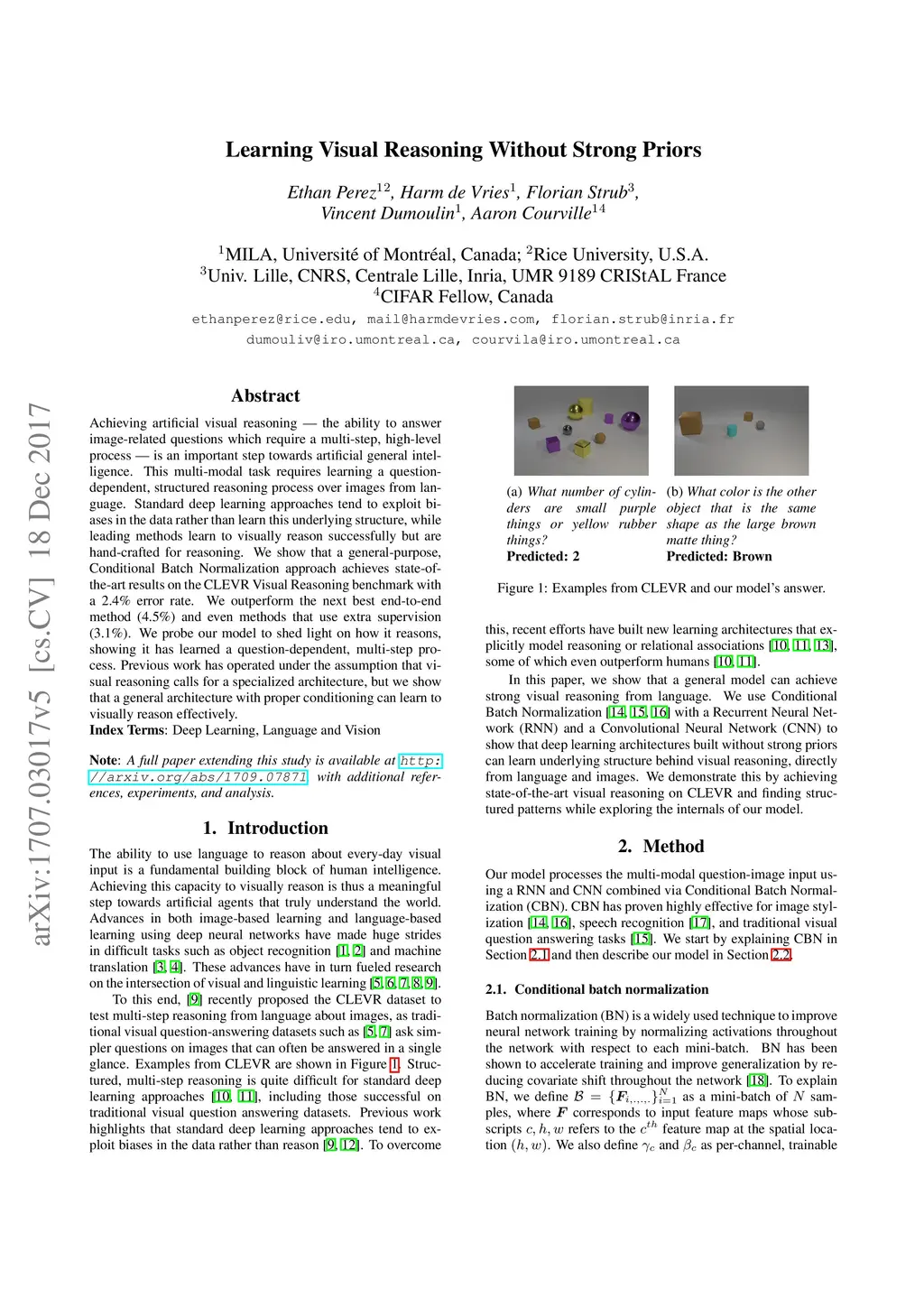 Achieving artificial visual reasoning - the ability to answer image-related questions which require a multi-step, high-level process - is an important step towards artificial general intelligence. This multi-modal task requires learning a question-dependent, structured reasoning process over images from language. Standard deep learning approaches tend to exploit biases in the data rather than learn this underlying structure, while leading methods learn to visually reason successfully but are hand-crafted for reasoning. We show that a general-purpose, Conditional Batch Normalization approach achieves state-of-the-art results on the CLEVR Visual Reasoning benchmark with a 2.4% error rate. We outperform the next best end-to-end method (4.5%) and even methods that use extra supervision (3.1%). We probe our model to shed light on how it reasons, showing it has learned a question-dependent, multi-step process. Previous work has operated under the assumption that visual reasoning calls for a specialized architecture, but we show that a general architecture with proper conditioning can learn to visually reason effectively.