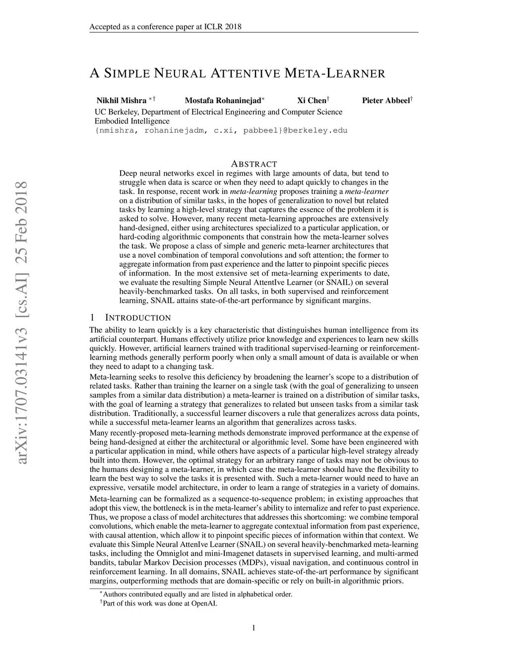 Deep neural networks excel in regimes with large amounts of data, but tend to struggle when data is scarce or when they need to adapt quickly to changes in the task. In response, recent work in meta-learning proposes training a meta-learner on a distribution of similar tasks, in the hopes of generalization to novel but related tasks by learning a high-level strategy that captures the essence of the problem it is asked to solve. However, many recent meta-learning approaches are extensively hand-designed, either using architectures specialized to a particular application, or hard-coding algorithmic components that constrain how the meta-learner solves the task. We propose a class of simple and generic meta-learner architectures that use a novel combination of temporal convolutions and soft attention; the former to aggregate information from past experience and the latter to pinpoint specific pieces of information. In the most extensive set of meta-learning experiments to date, we evaluate the resulting Simple Neural AttentIve Learner (or SNAIL) on several heavily-benchmarked tasks. On all tasks, in both supervised and reinforcement learning, SNAIL attains state-of-the-art performance by significant margins.