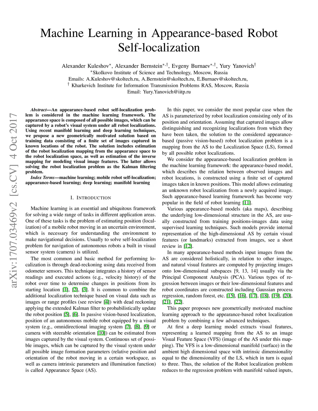 We consider an appearance-based robot self-localization problem in the machine learning framework. Using recent manifold learning techniques, we propose a new geometrically motivated solution. The solution includes estimation of the robot localization mapping from the appearance manifold to the robot localization space, as well as estimation of the inverse mapping for image modeling. The latter allows solving the robot localization problem as a Kalman filtering problem.