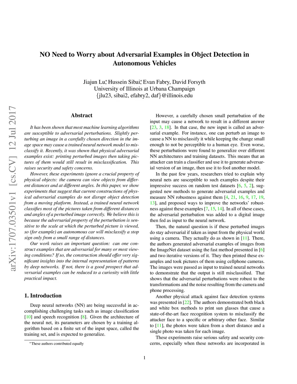 It has been shown that most machine learning algorithms are susceptible to adversarial perturbations. Slightly perturbing an image in a carefully chosen direction in the image space may cause a trained neural network model to misclassify it. Recently, it was shown that physical adversarial examples exist: printing perturbed images then taking pictures of them would still result in misclassification. This raises security and safety concerns. However, these experiments ignore a crucial property of physical objects: the camera can view objects from different distances and at different angles. In this paper, we show experiments that suggest that current constructions of physical adversarial examples do not disrupt object detection from a moving platform. Instead, a trained neural network classifies most of the pictures taken from different distances and angles of a perturbed image correctly. We believe this is because the adversarial property of the perturbation is sensitive to the scale at which the perturbed picture is viewed, so (for example) an autonomous car will misclassify a stop sign only from a small range of distances. Our work raises an important question: can one construct examples that are adversarial for many or most viewing conditions? If so, the construction should offer very significant insights into the internal representation of patterns by deep networks. If not, there is a good prospect that adversarial examples can be reduced to a curiosity with little practical impact.