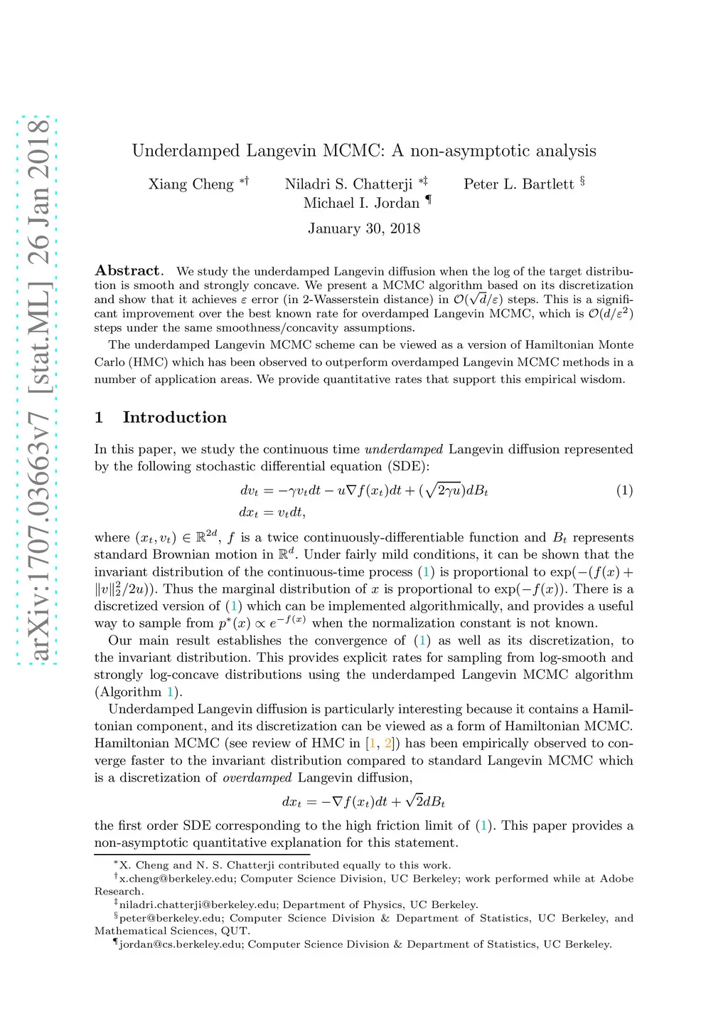 We study the underdamped Langevin diffusion when the log of the target distribution is smooth and strongly concave. We present a MCMC algorithm based on its discretization and show that it achieves error (in 2-Wasserstein distance) in steps. This is a significant improvement over the best known rate for overdamped Langevin MCMC, which is steps under the same smoothness/concavity assumptions. The underdamped Langevin MCMC scheme can be viewed as a version of Hamiltonian Monte Carlo (HMC) which has been observed to outperform overdamped Langevin MCMC methods in a number of application areas. We provide quantitative rates that support this empirical wisdom.