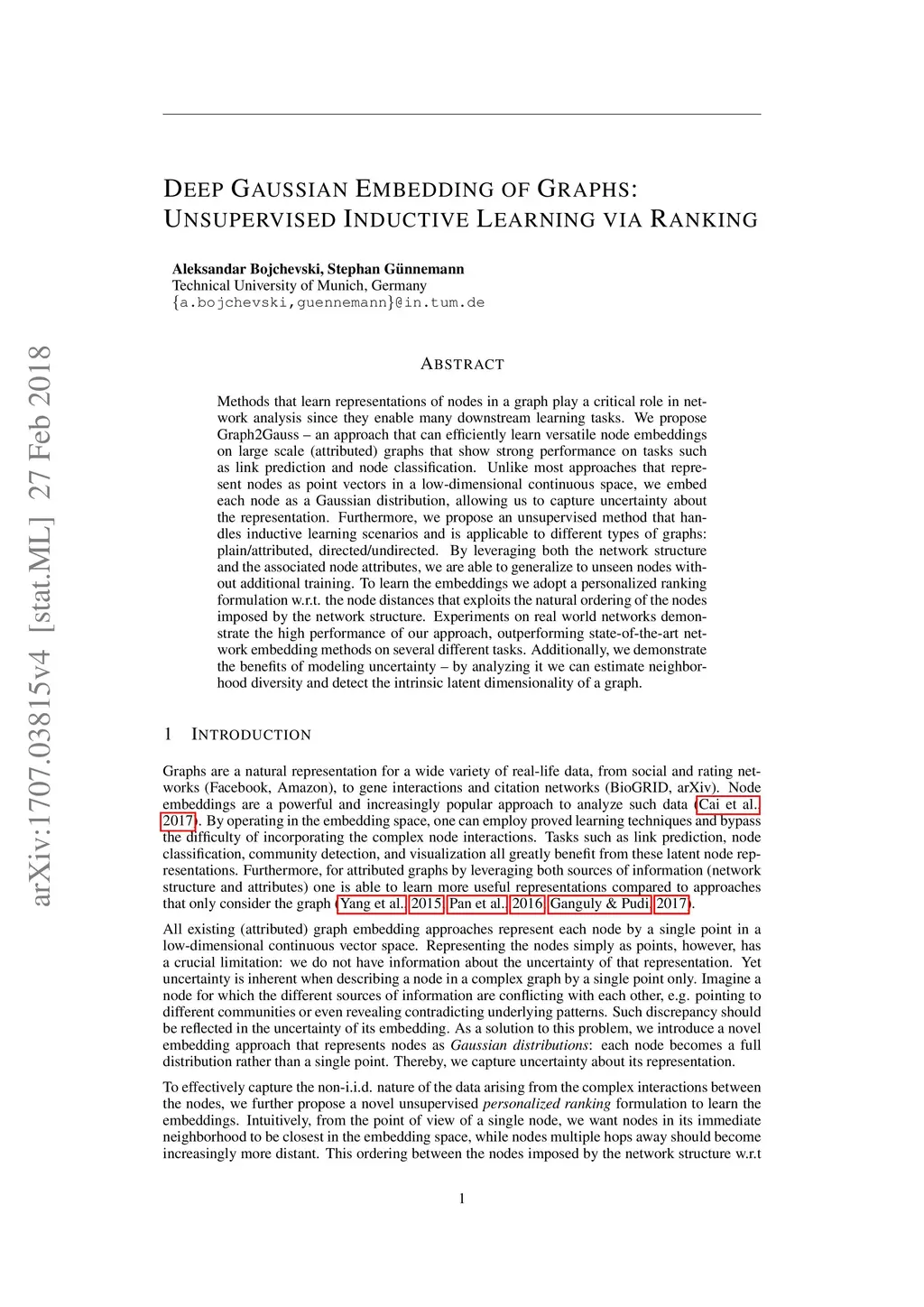 Methods that learn representations of nodes in a graph play a critical role in network analysis since they enable many downstream learning tasks. We propose Graph2Gauss - an approach that can efficiently learn versatile node embeddings on large scale (attributed) graphs that show strong performance on tasks such as link prediction and node classification. Unlike most approaches that represent nodes as point vectors in a low-dimensional continuous space, we embed each node as a Gaussian distribution, allowing us to capture uncertainty about the representation. Furthermore, we propose an unsupervised method that handles inductive learning scenarios and is applicable to different types of graphs: plain/attributed, directed/undirected. By leveraging both the network structure and the associated node attributes, we are able to generalize to unseen nodes without additional training. To learn the embeddings we adopt a personalized ranking formulation w.r.t. the node distances that exploits the natural ordering of the nodes imposed by the network structure. Experiments on real world networks demonstrate the high performance of our approach, outperforming state-of-the-art network embedding methods on several different tasks. Additionally, we demonstrate the benefits of modeling uncertainty - by analyzing it we can estimate neighborhood diversity and detect the intrinsic latent dimensionality of a graph.
